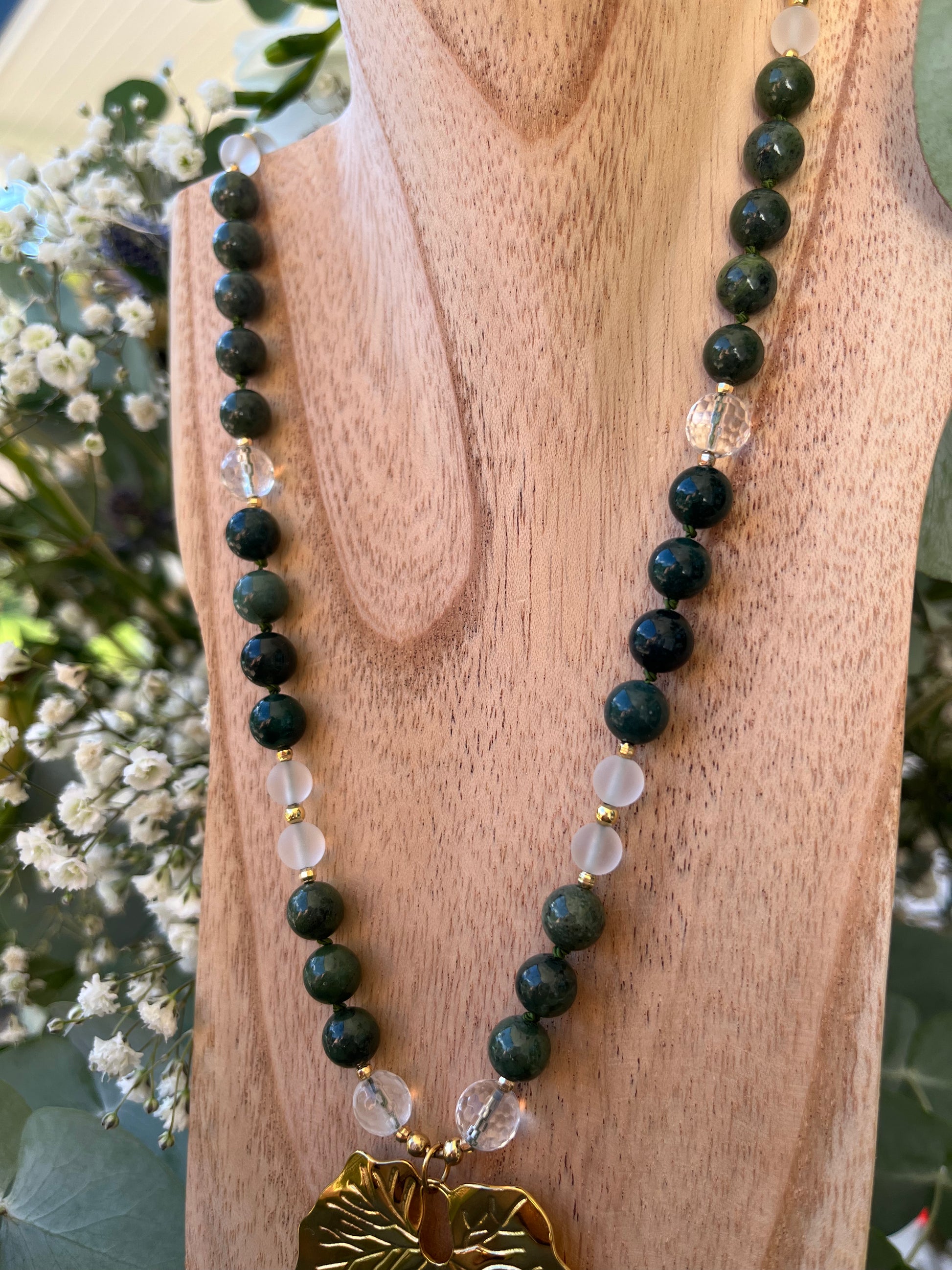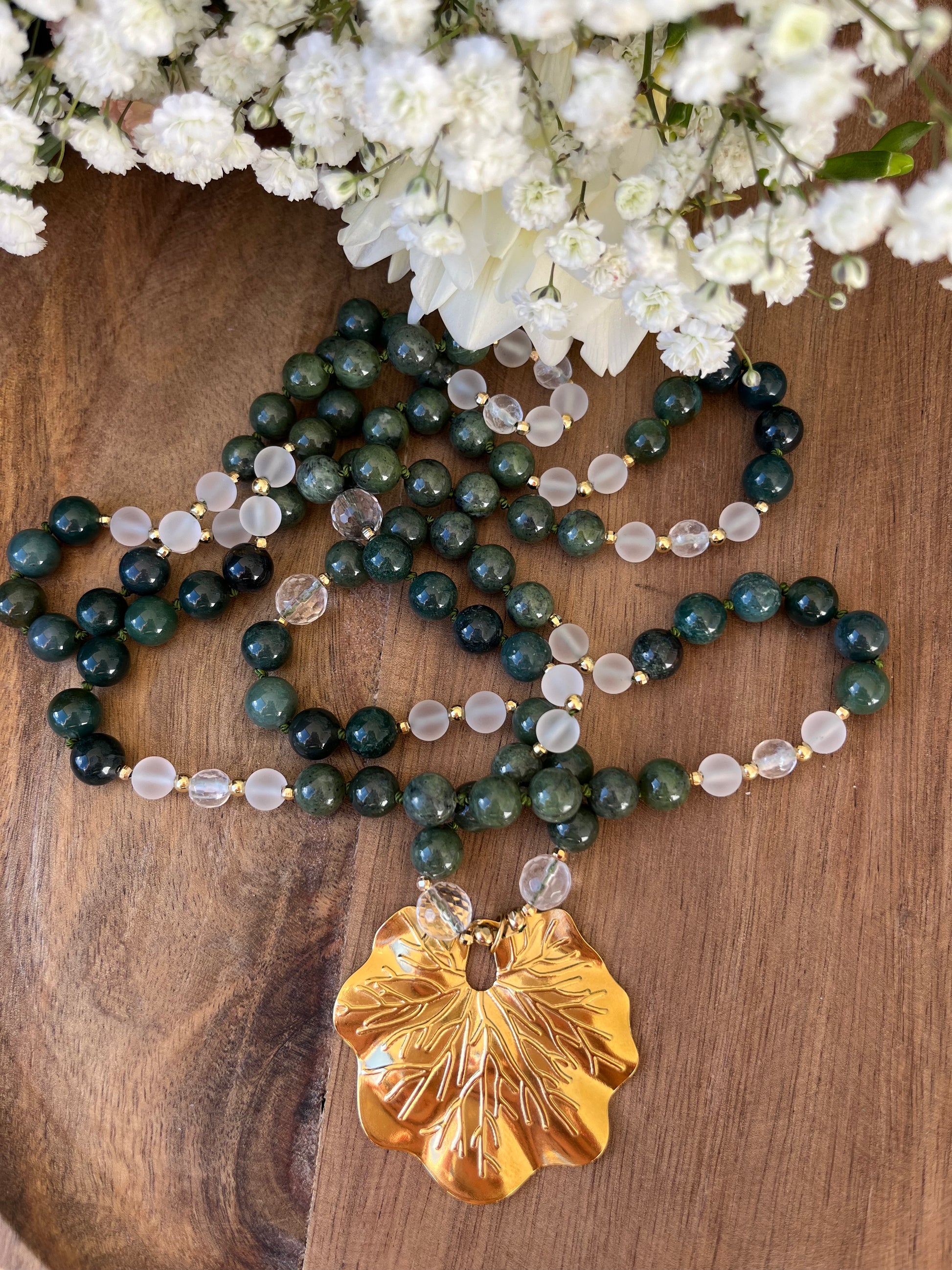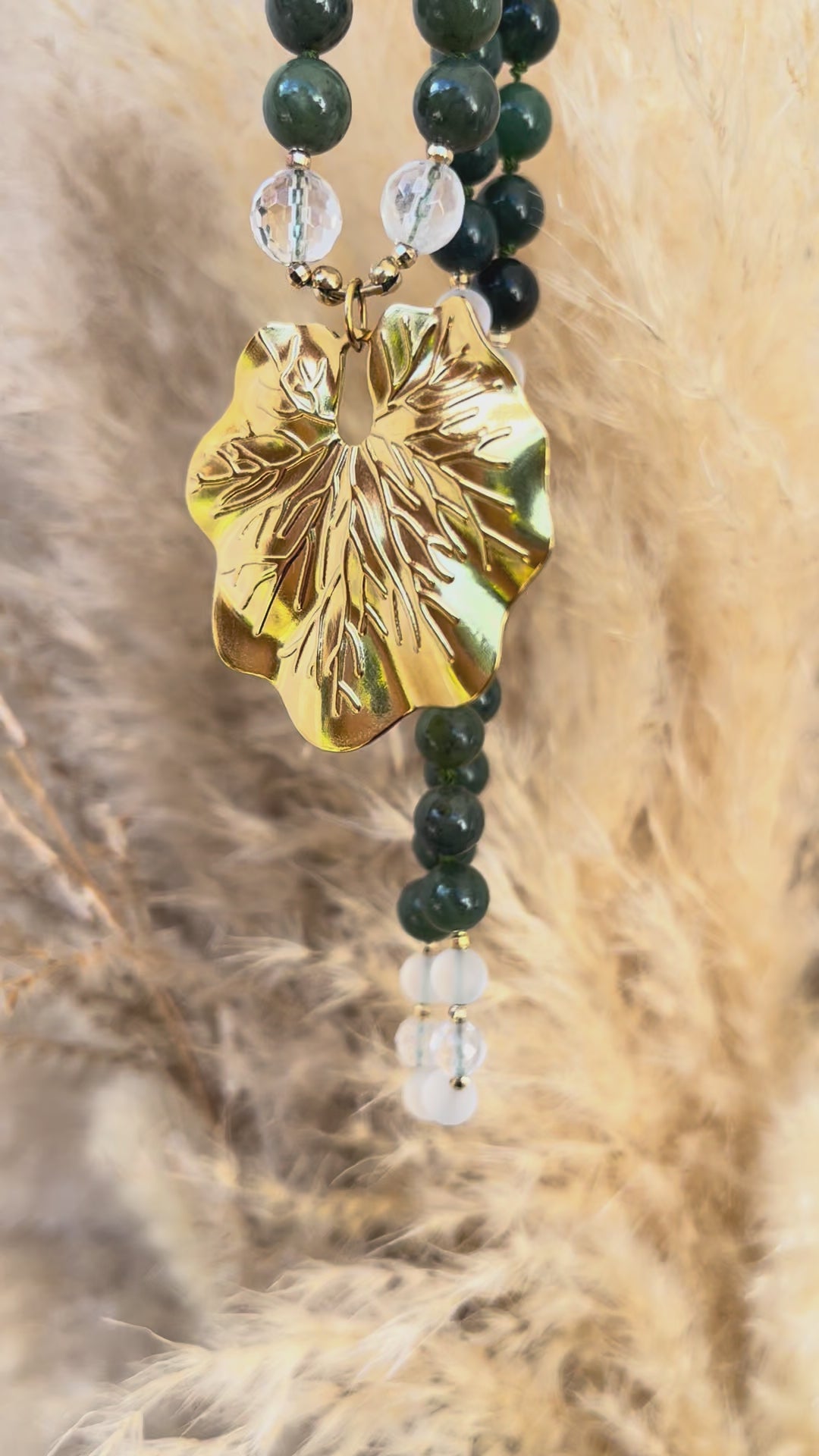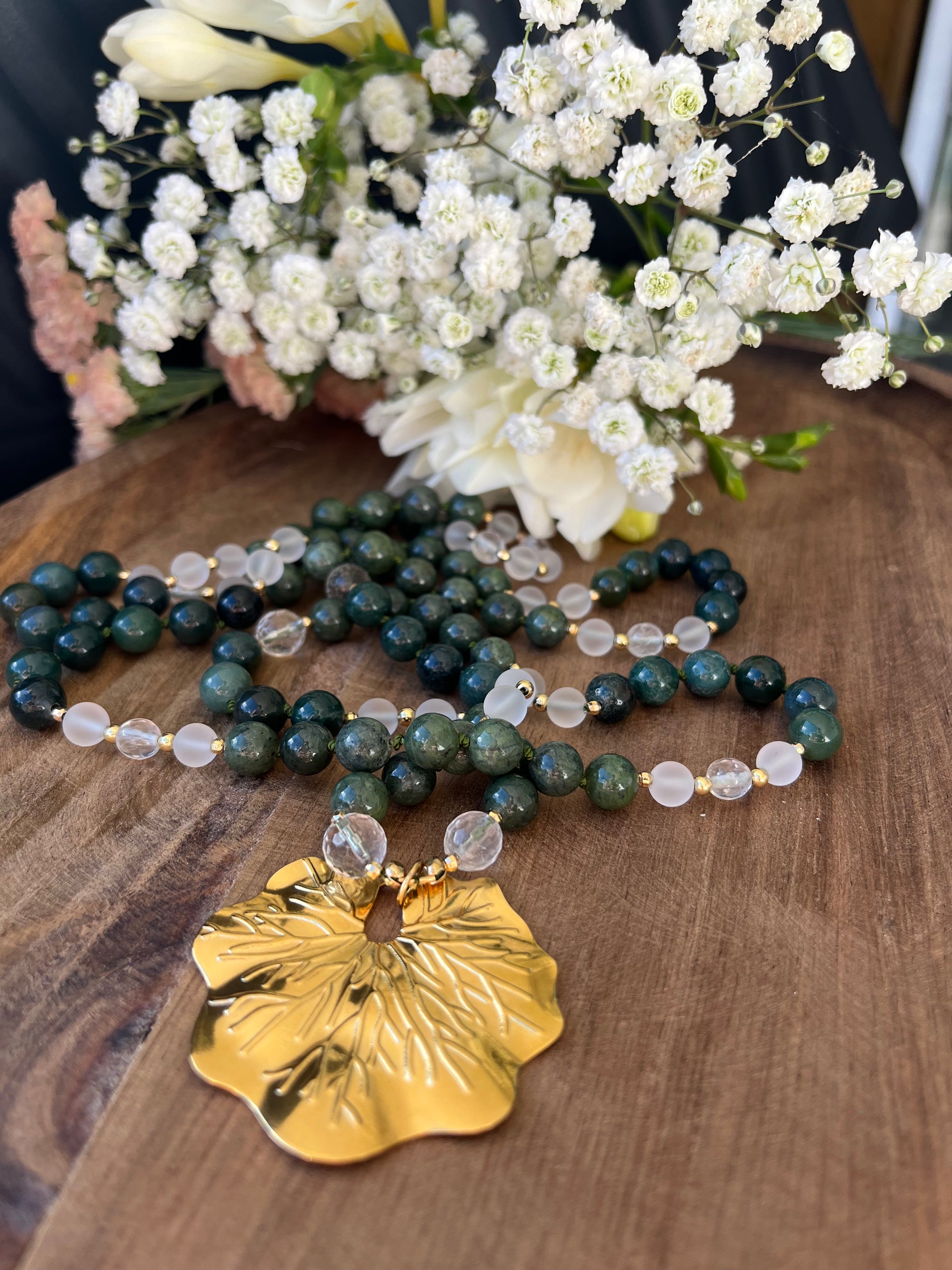 Le mala est magnifié par de fins apprêts dorés et un pendentif feuille , symbole de croissance, de renouveau et de lien profond avec la nature.