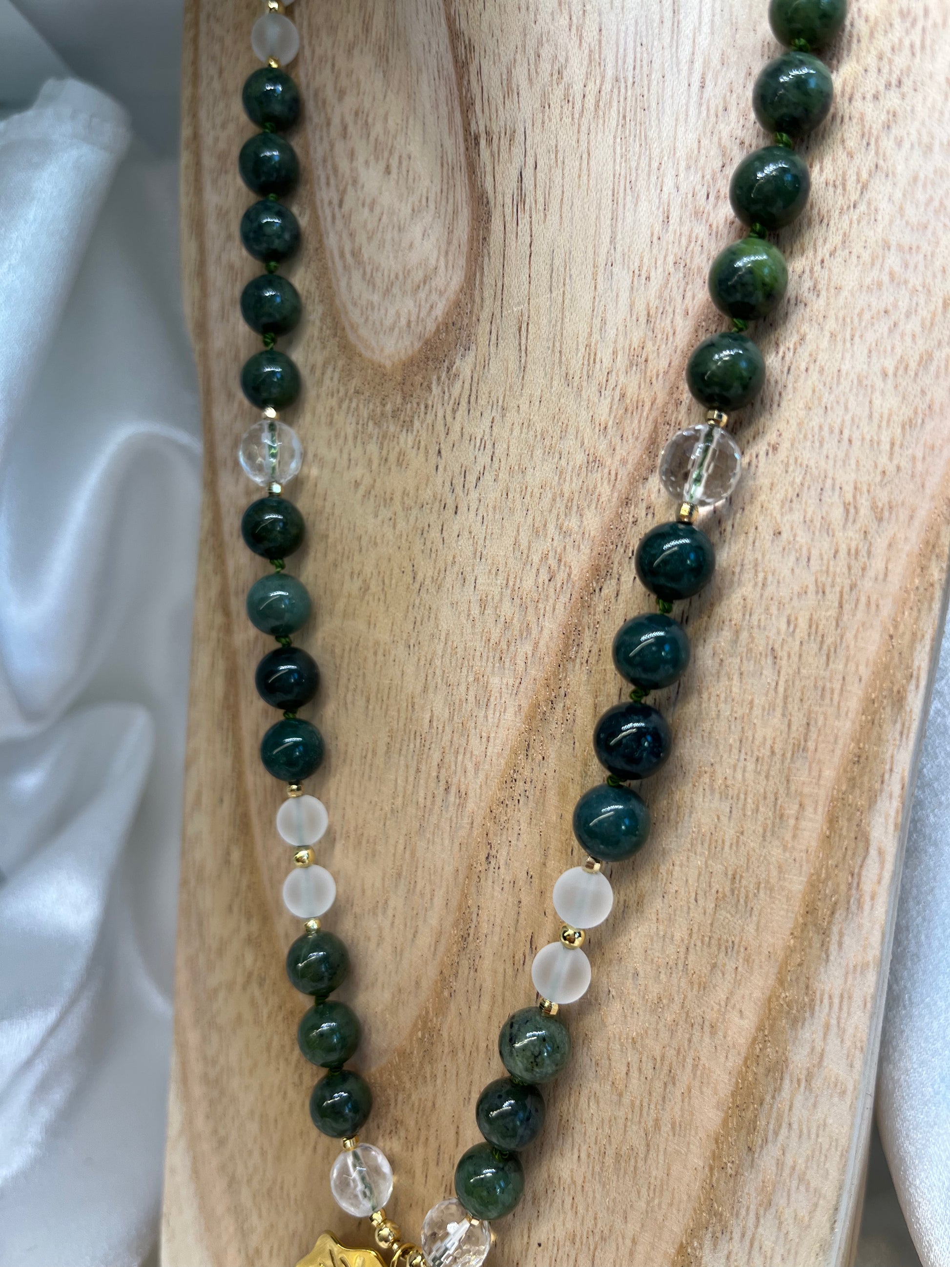 Ce mala vibrant est composé de 108 perles naturelles de 8 mm , unissant la lumière pure du Cristal de Roche , la force vivante de l' Agate Mousse et la sérénité du Jade Vert . Une création pensée pour vous relier à la nature, amplifier vos intentions et apporter équilibre et prospérité.
