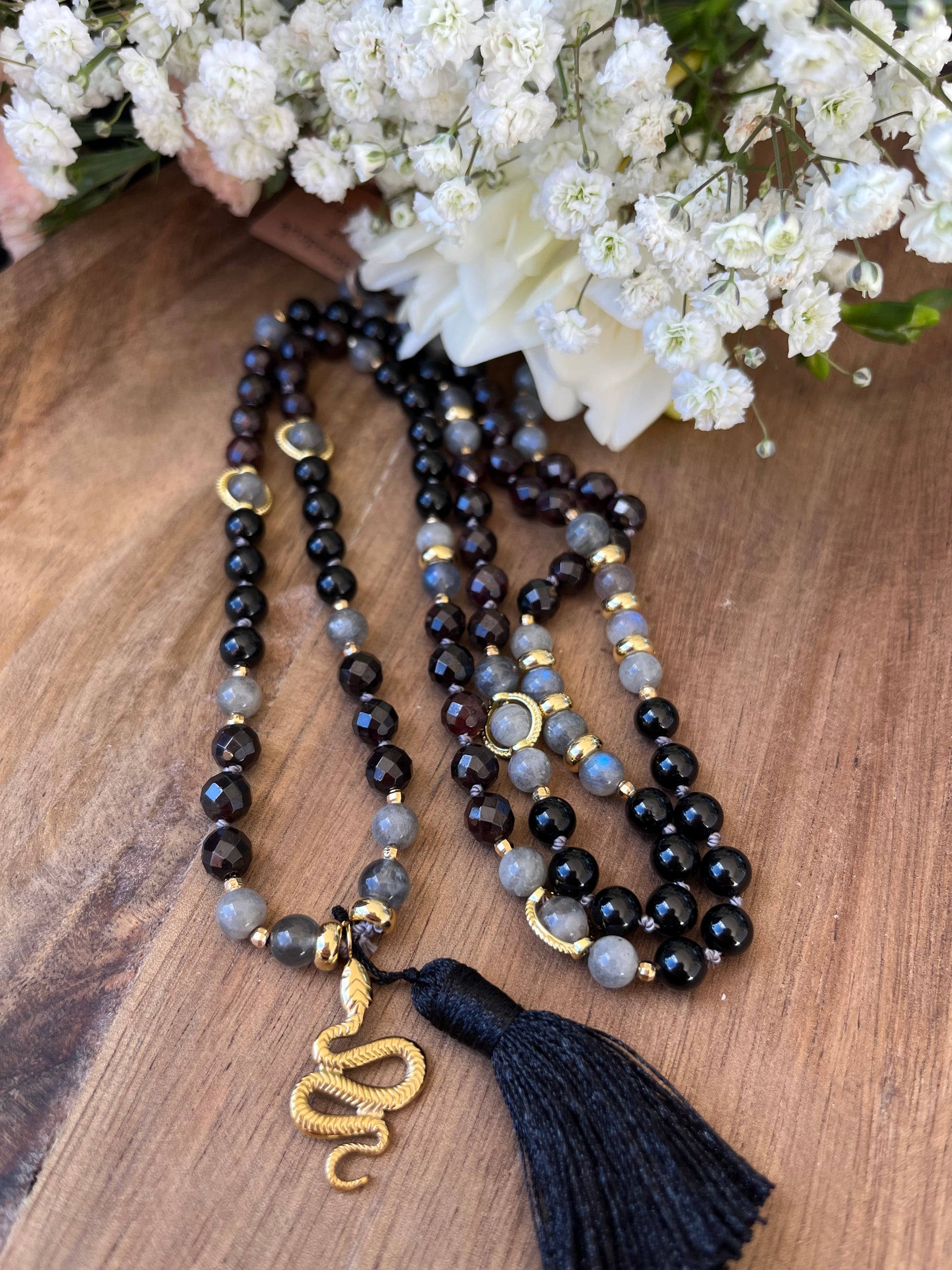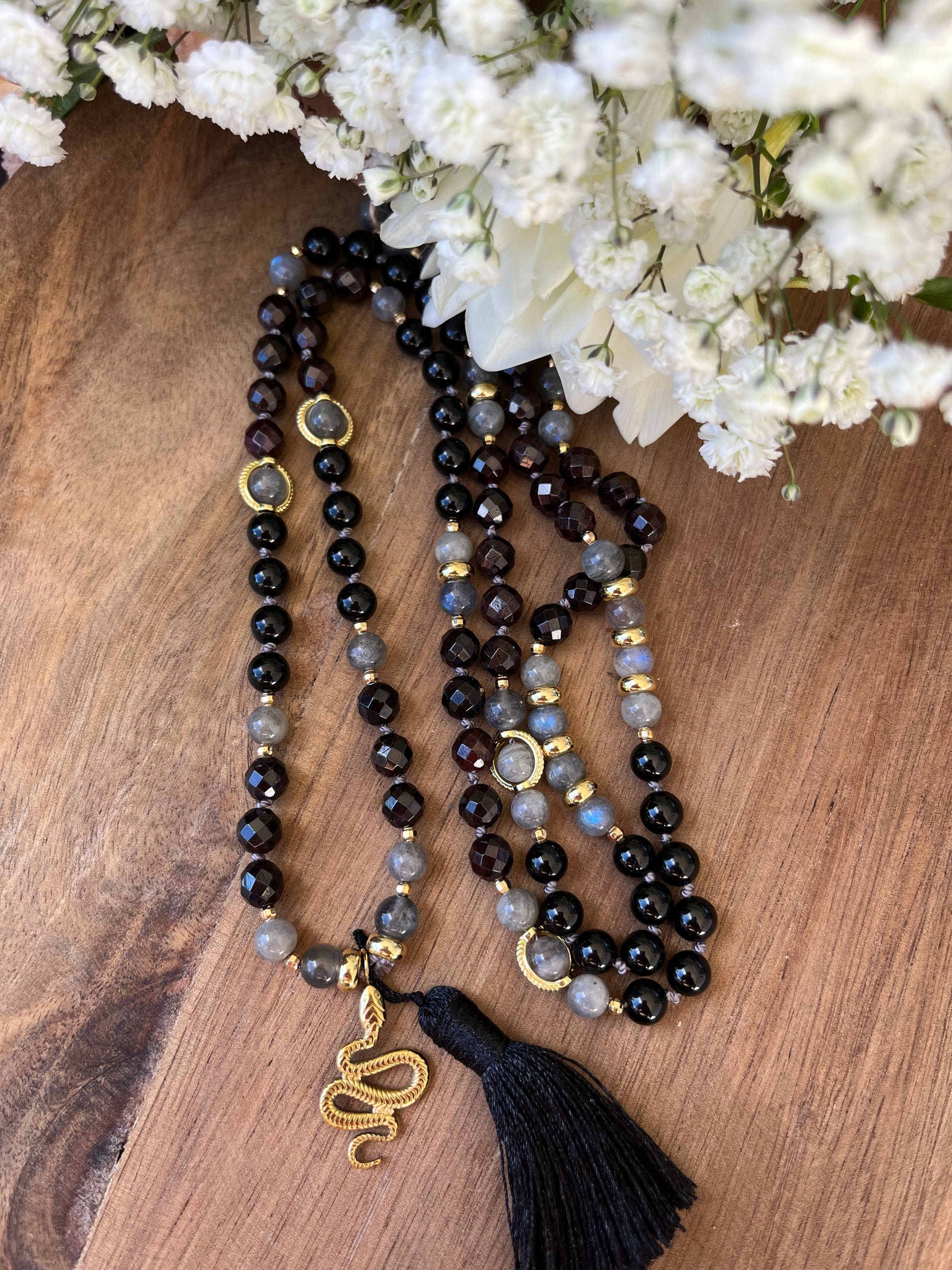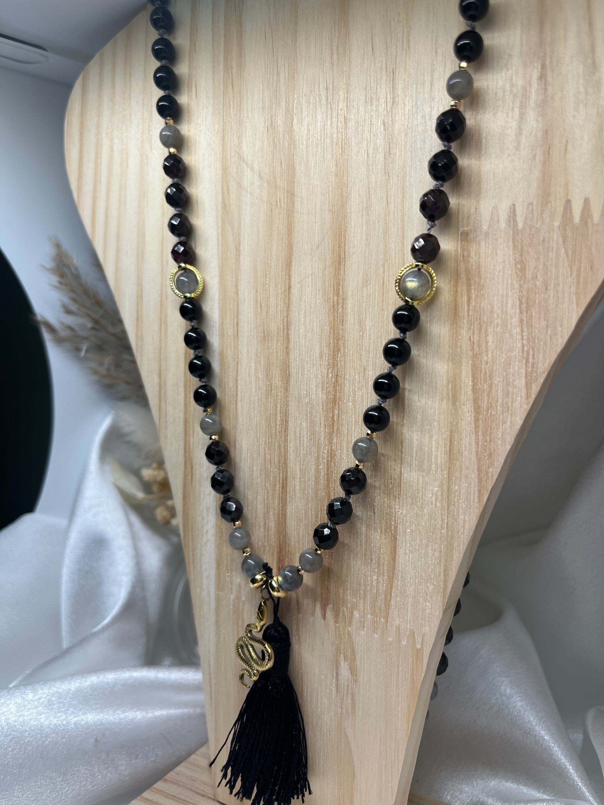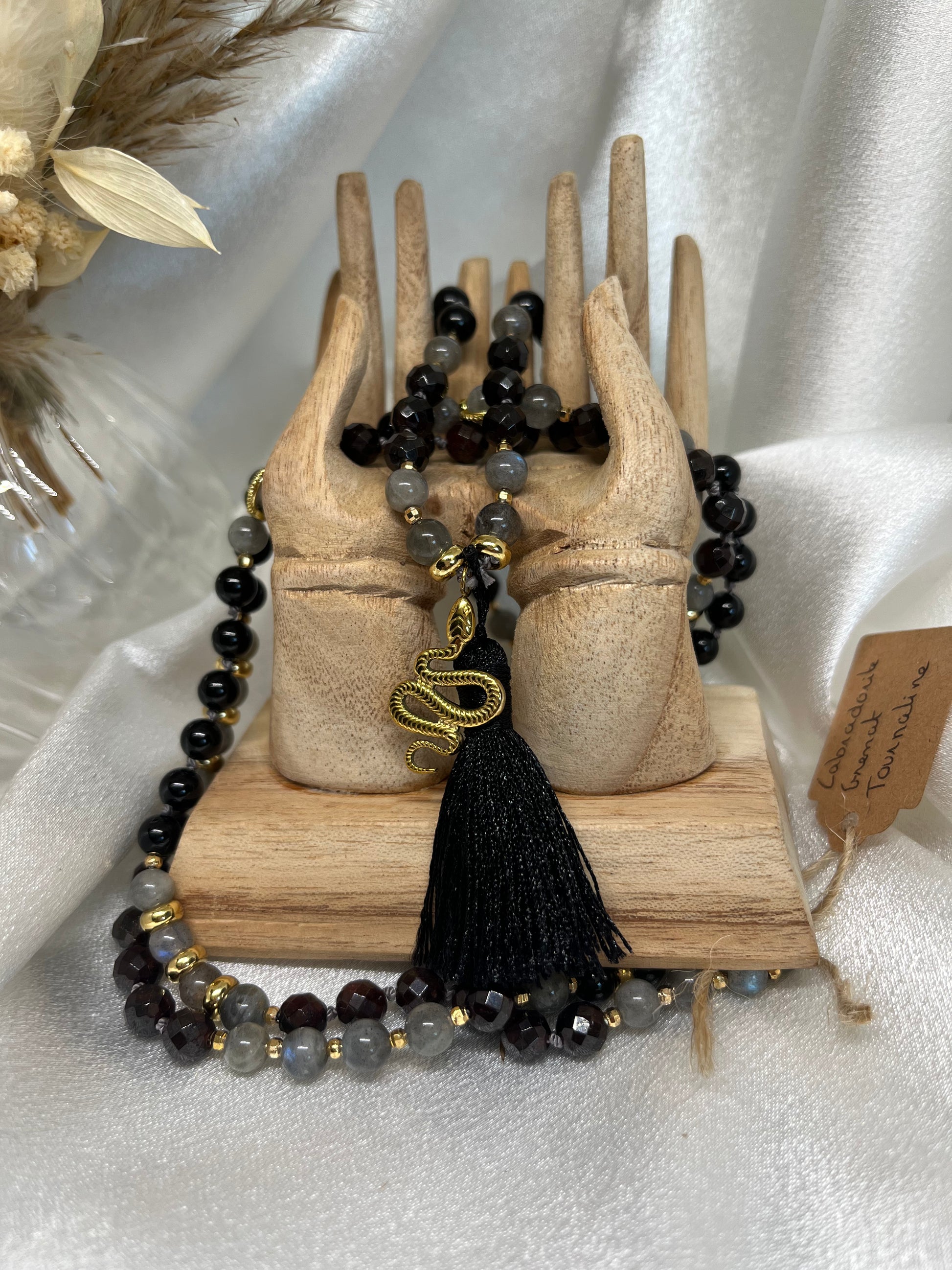 Ce mala intense et raffiné est composé de 108 perles naturelles de 6 mm, réunissant la puissance du Grenat, la protection de la Labradorite et la force purificatrice de la Tourmaline Noire. Une combinaison énergétique forte, pensée comme un talisman de transformation et de protection.