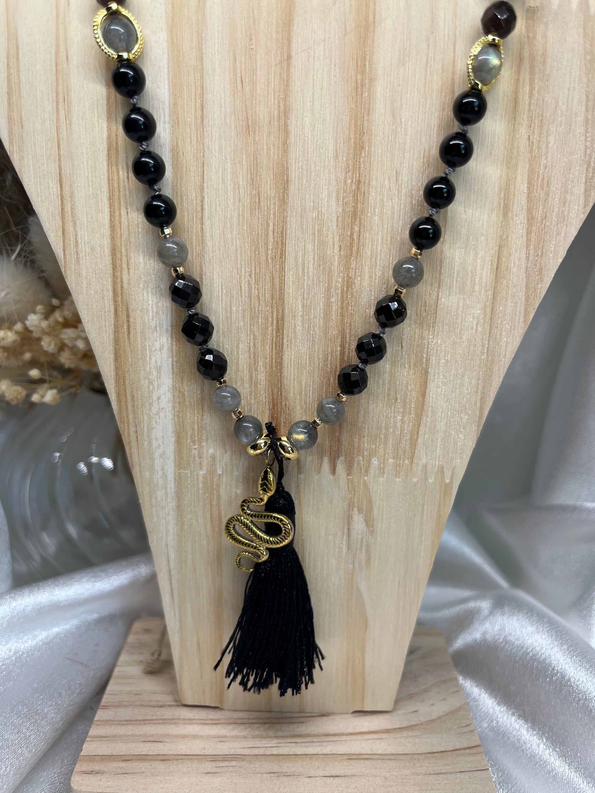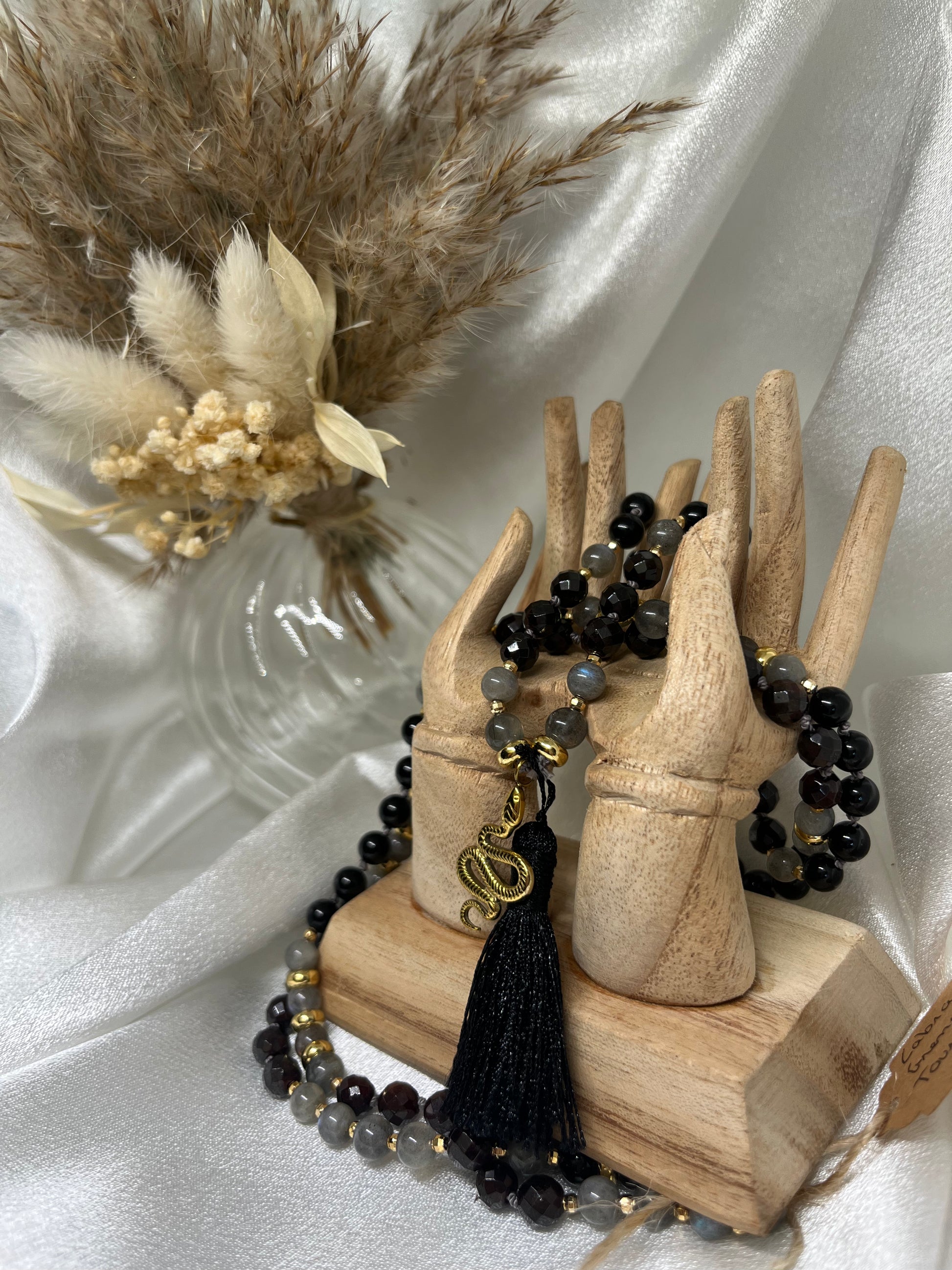 Le mala est magnifié par des apprêts dorés élégants, un pompon noir symbole d’ancrage et de mystère, et un pendentif serpent doré. Symbole ancien de transformation, de renaissance et de puissance vitale, le serpent incarne la régénération et la sagesse profonde.