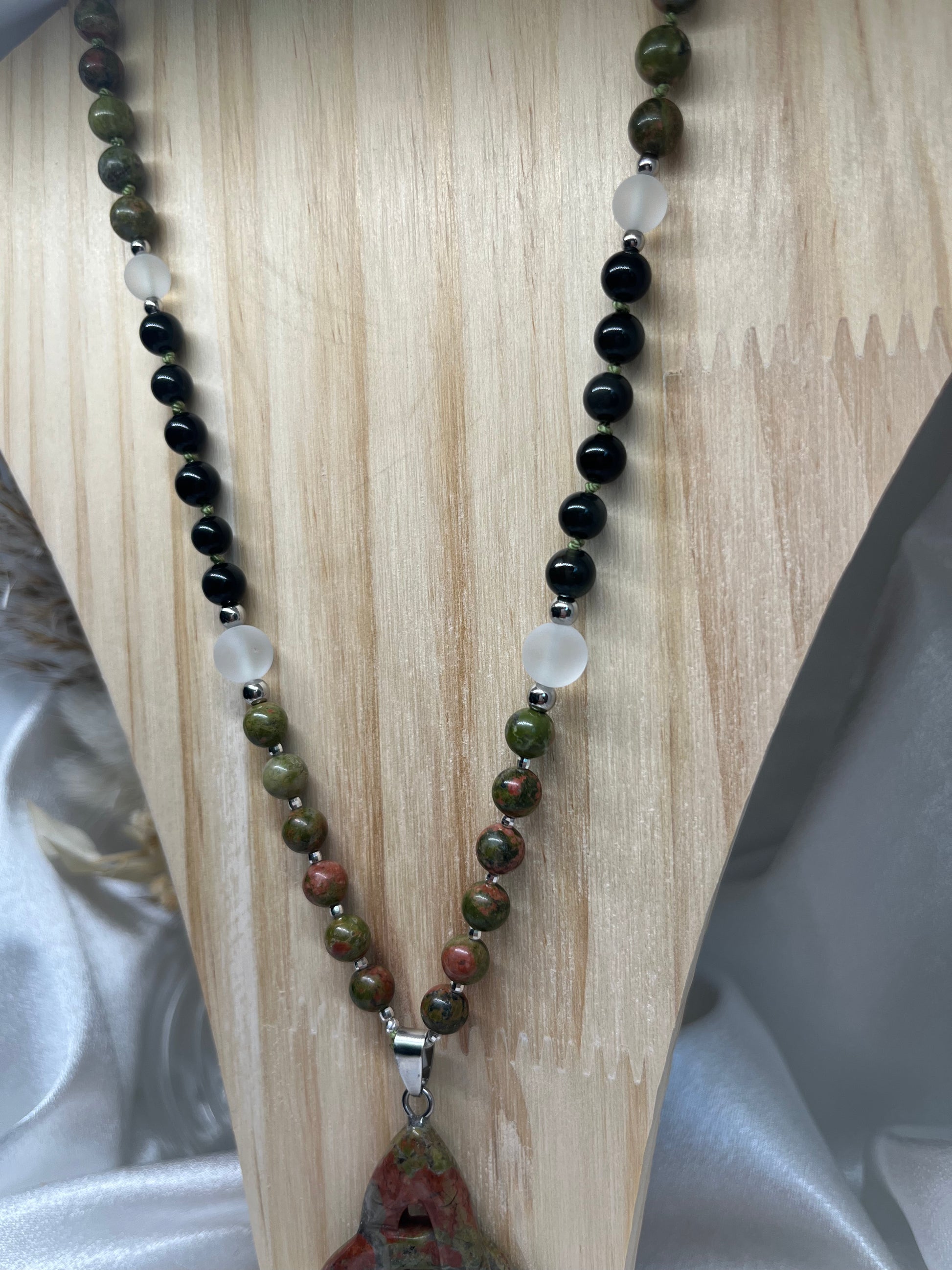 Le mala est sublimé par un pendentif en Unakite, pierre mise en lumière en son centre, et des apprêts argentés qui apportent éclat et modernité.