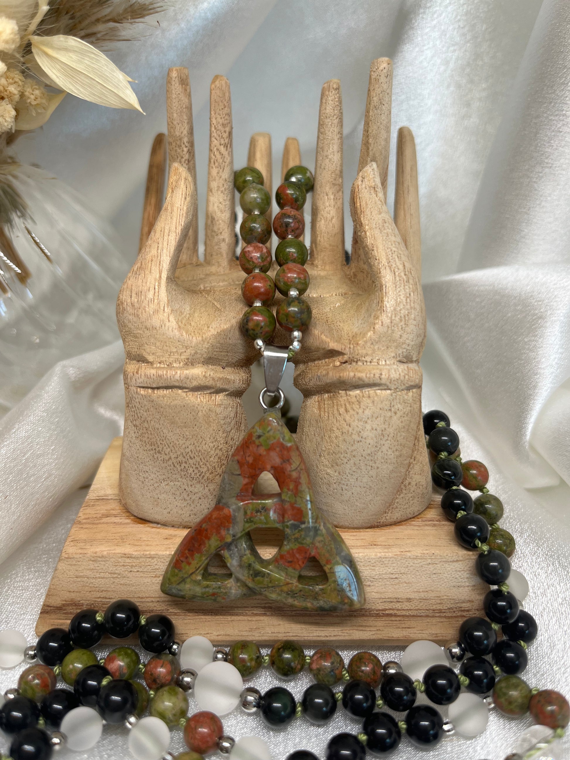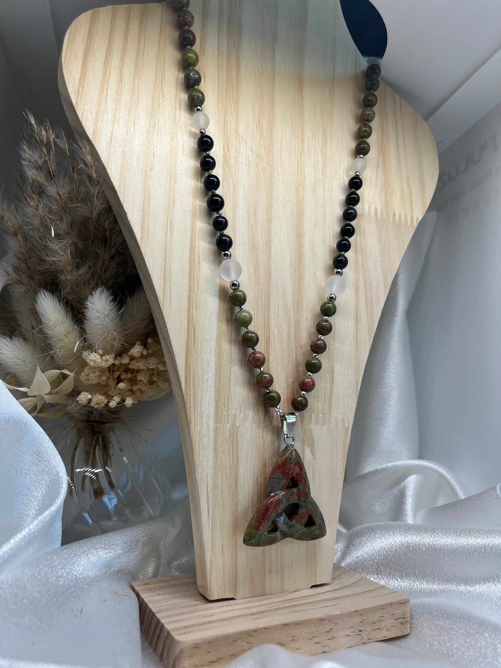 Ce mala unit la douceur de l’Unakite, la puissance protectrice de la Tourmaline et la lumière pure du Cristal de Roche, en un compagnon sacré pour votre cheminement intérieur.