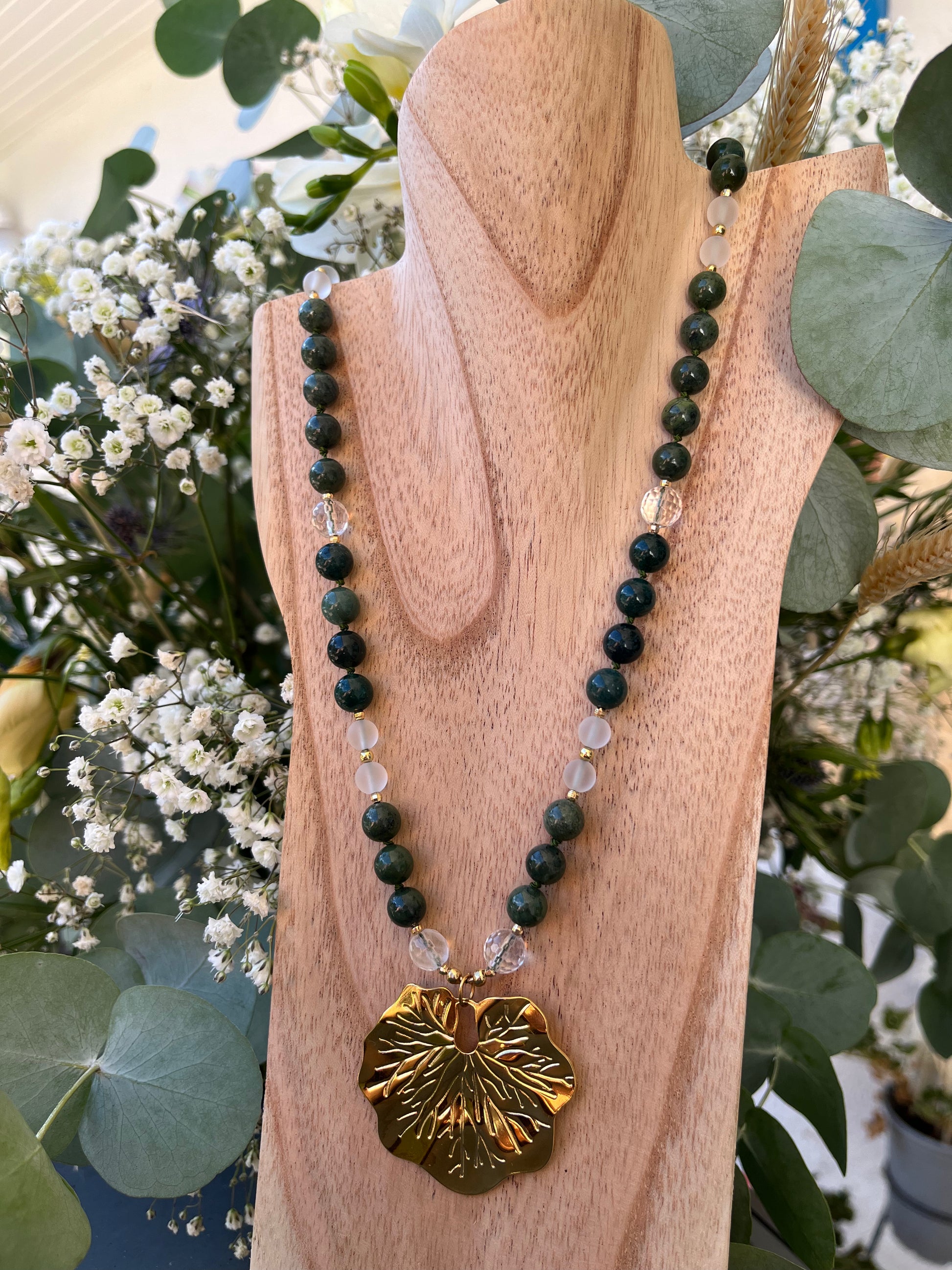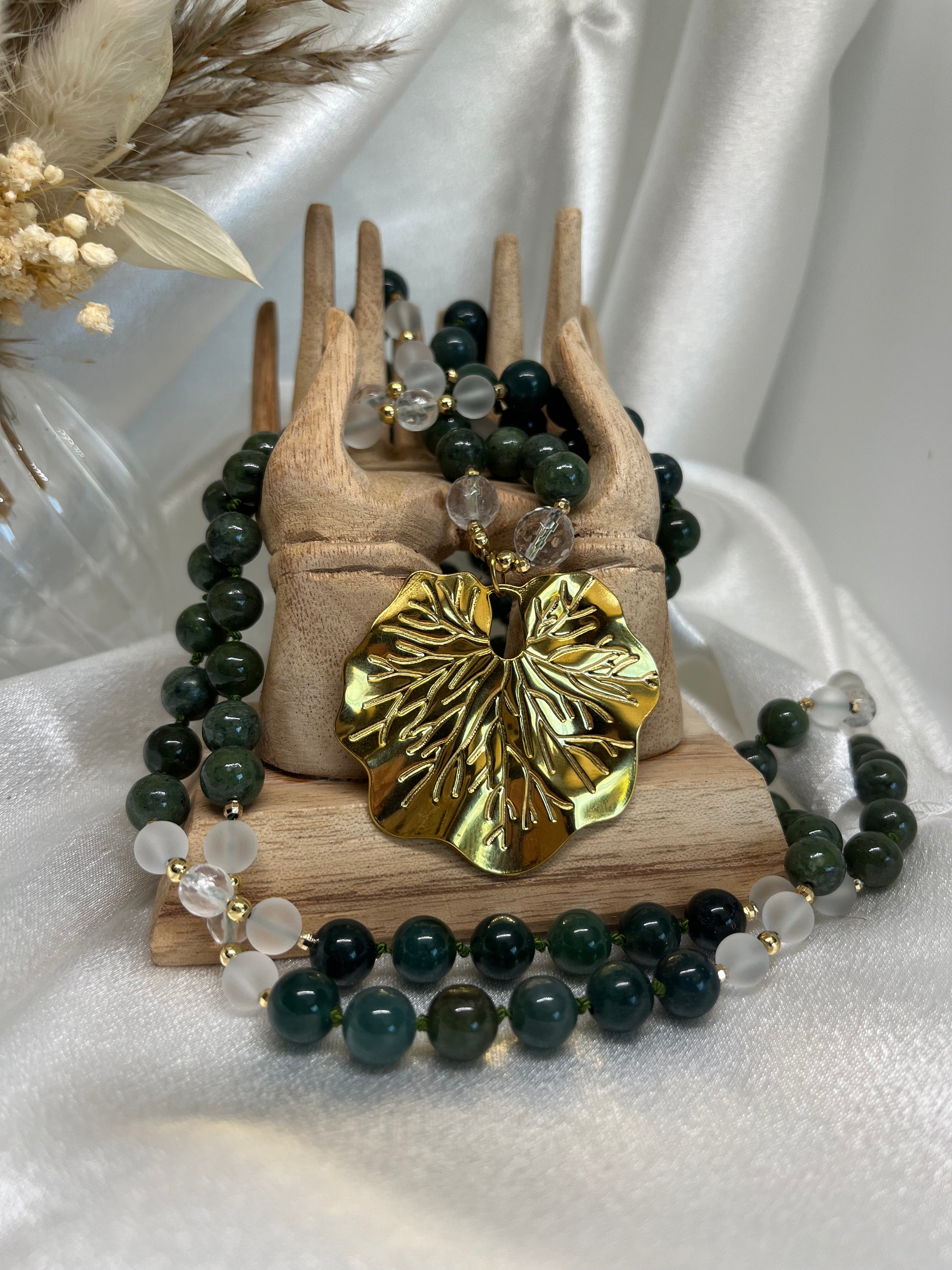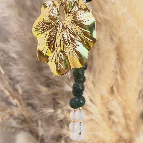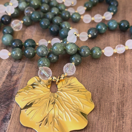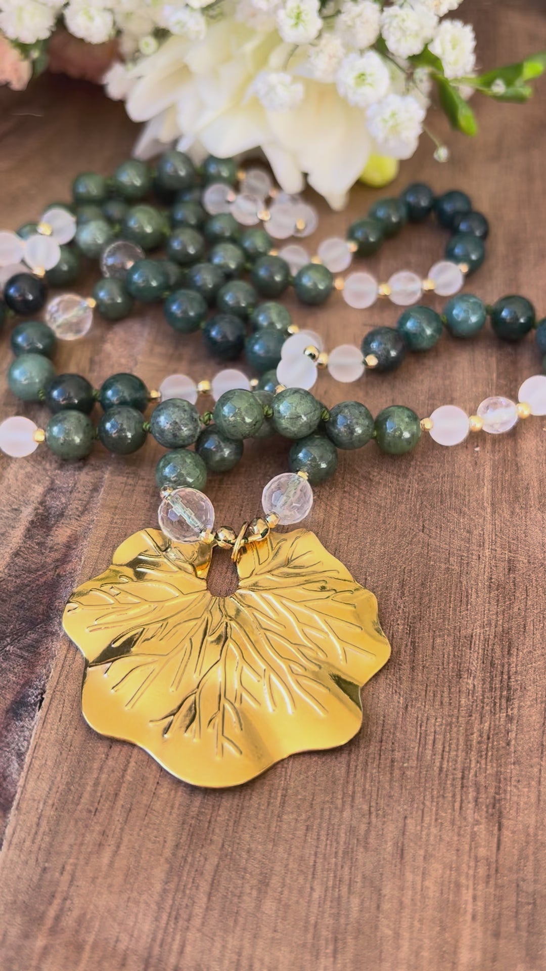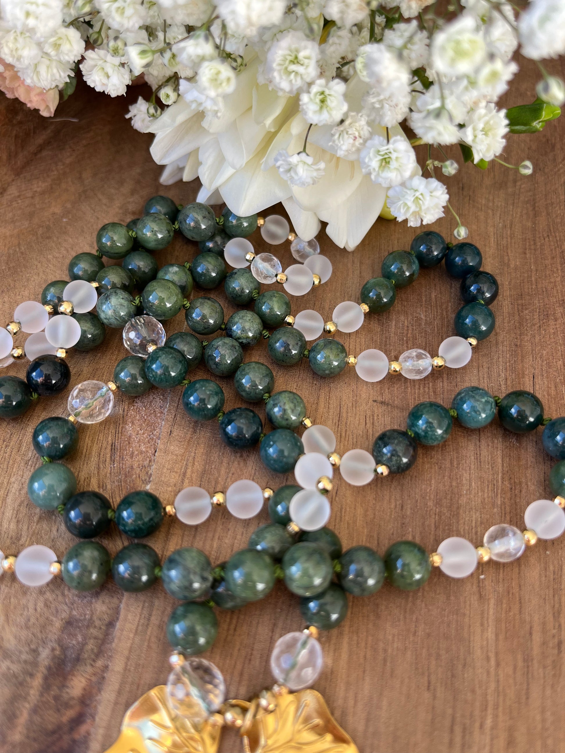 Il mala è impreziosito da raffinati elementi dorati e da un pendente a forma di foglia , simbolo di crescita, rinnovamento e profondo legame con la natura.