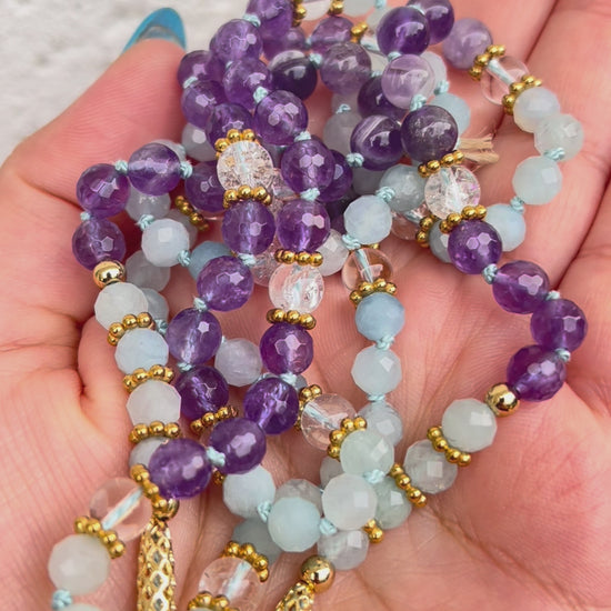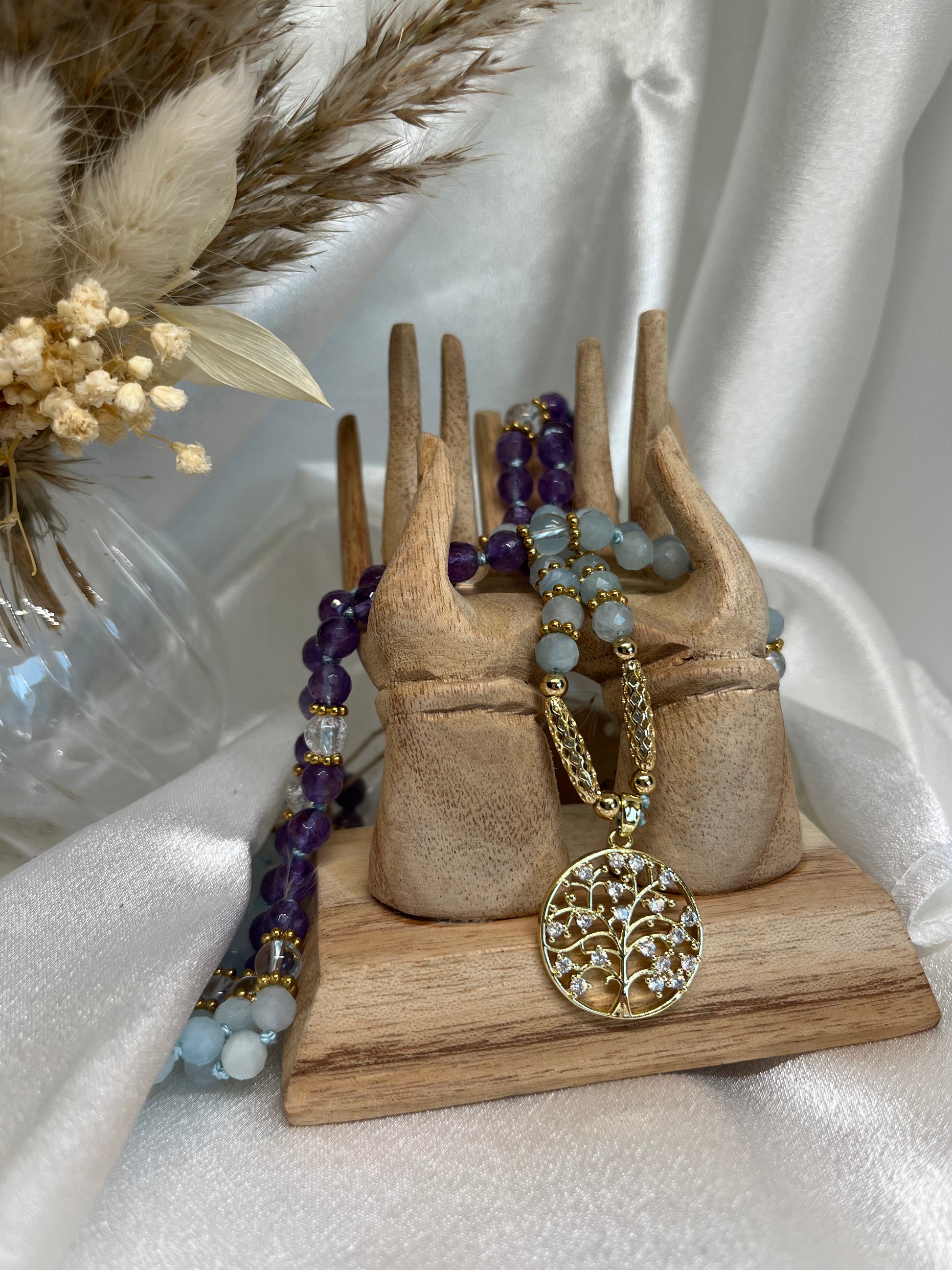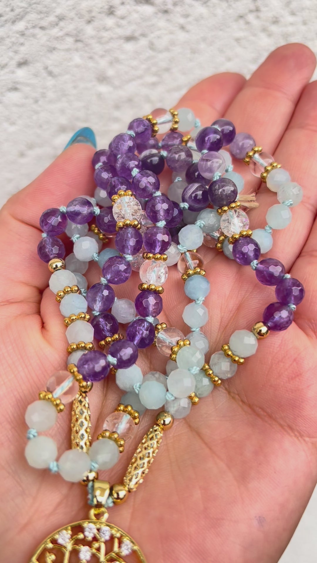 Ce mala élégant est composé de 108 perles naturelles de 6 mm, unissant la profondeur de l’Améthyste, la douceur de l’Aigue-Marine, et la pureté du Cristal de Roche. Une création pensée comme un véritable talisman de sérénité et d’élévation.
