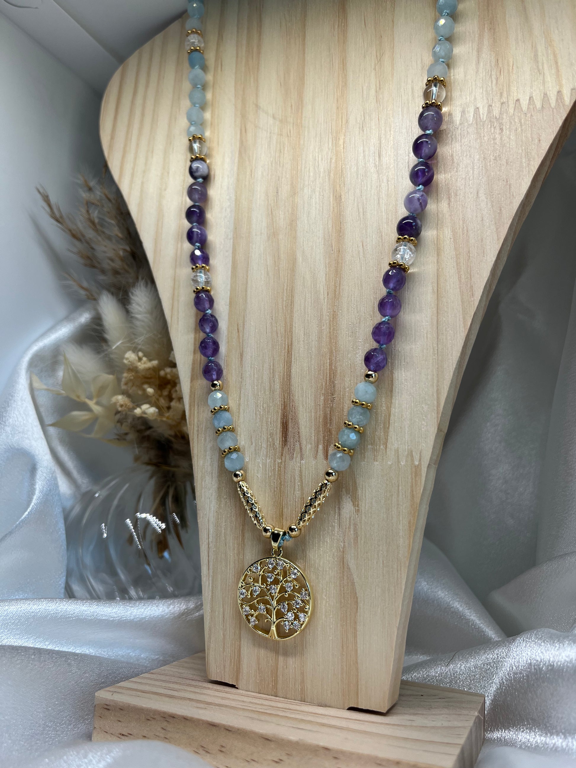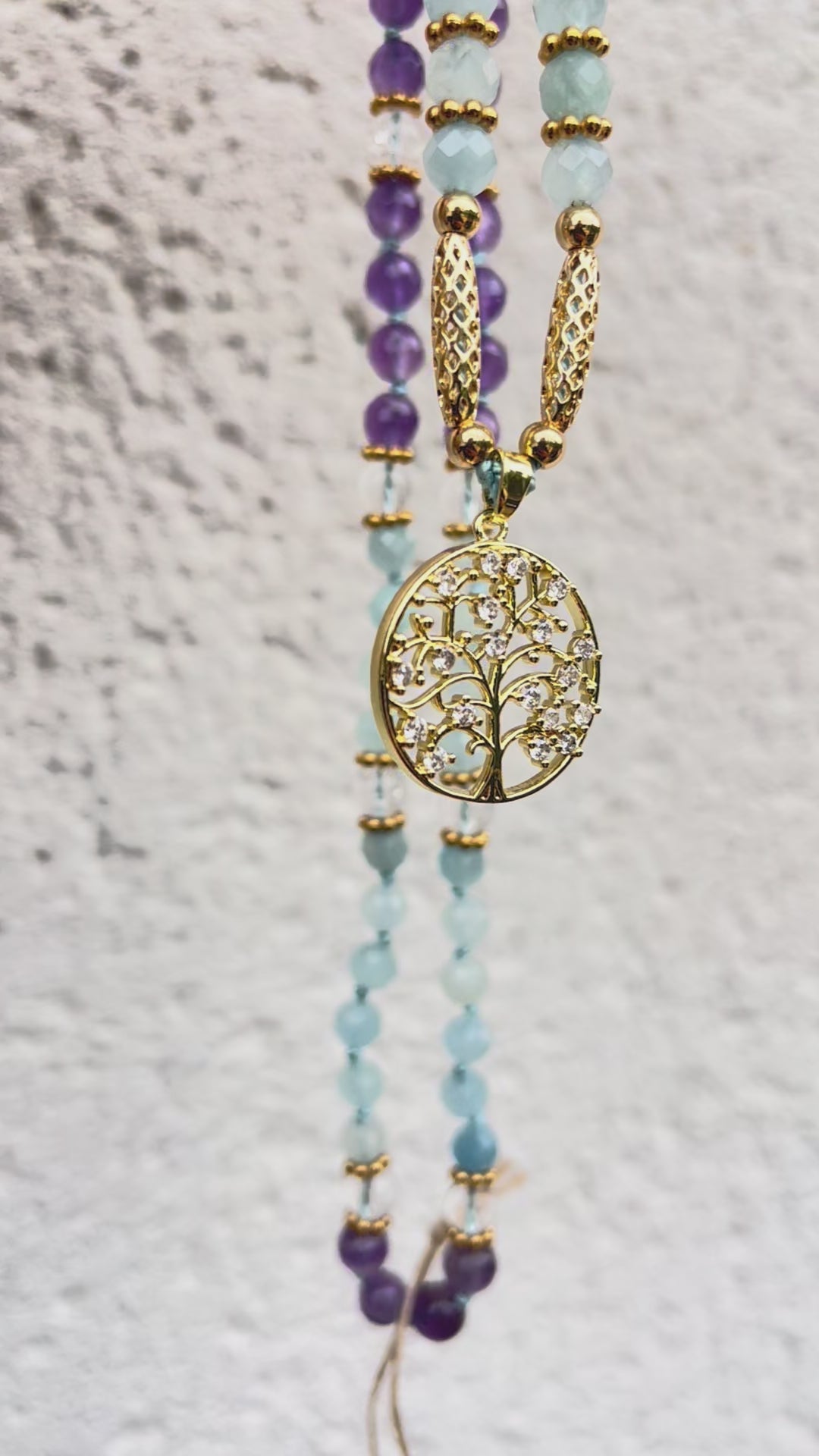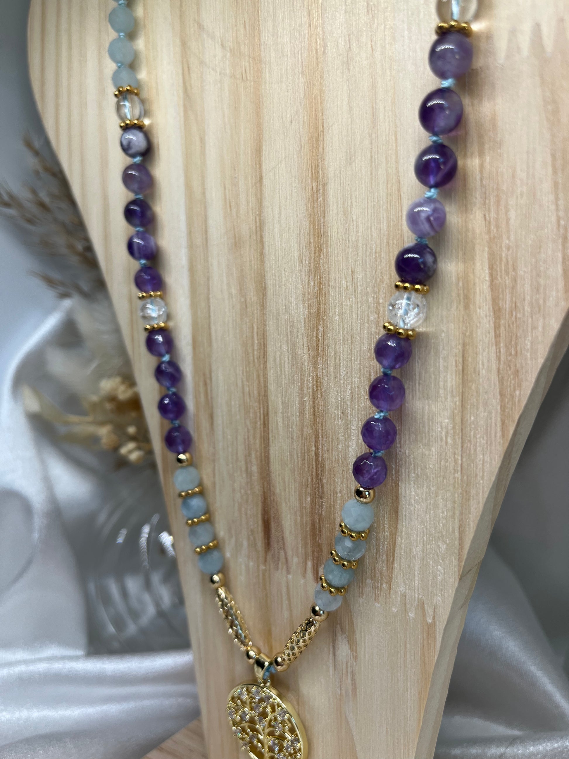 Ce mala élégant est composé de 108 perles naturelles de 6 mm, unissant la profondeur de l’Améthyste, la douceur de l’Aigue-Marine, et la pureté du Cristal de Roche. Une création pensée comme un véritable talisman de sérénité et d’élévation.