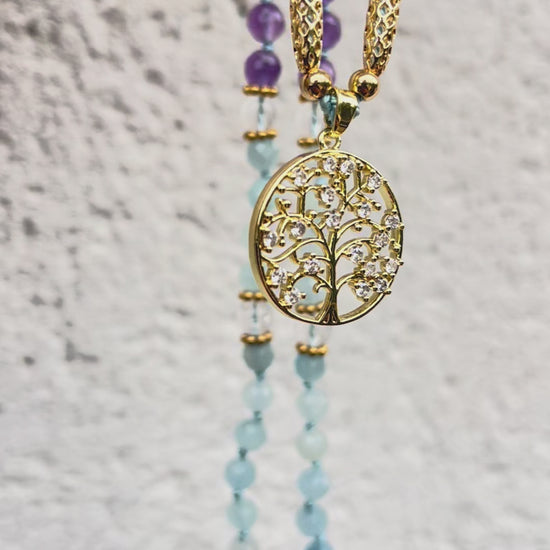 Le mala est sublimé par des apprêts dorés raffinés, et un pendentif Arbre de Vie, puissant symbole d’ancrage, de croissance et d’unité. L’Arbre de Vie relie la Terre et le Ciel, invitant à la connexion avec soi, avec les autres et avec l’univers.