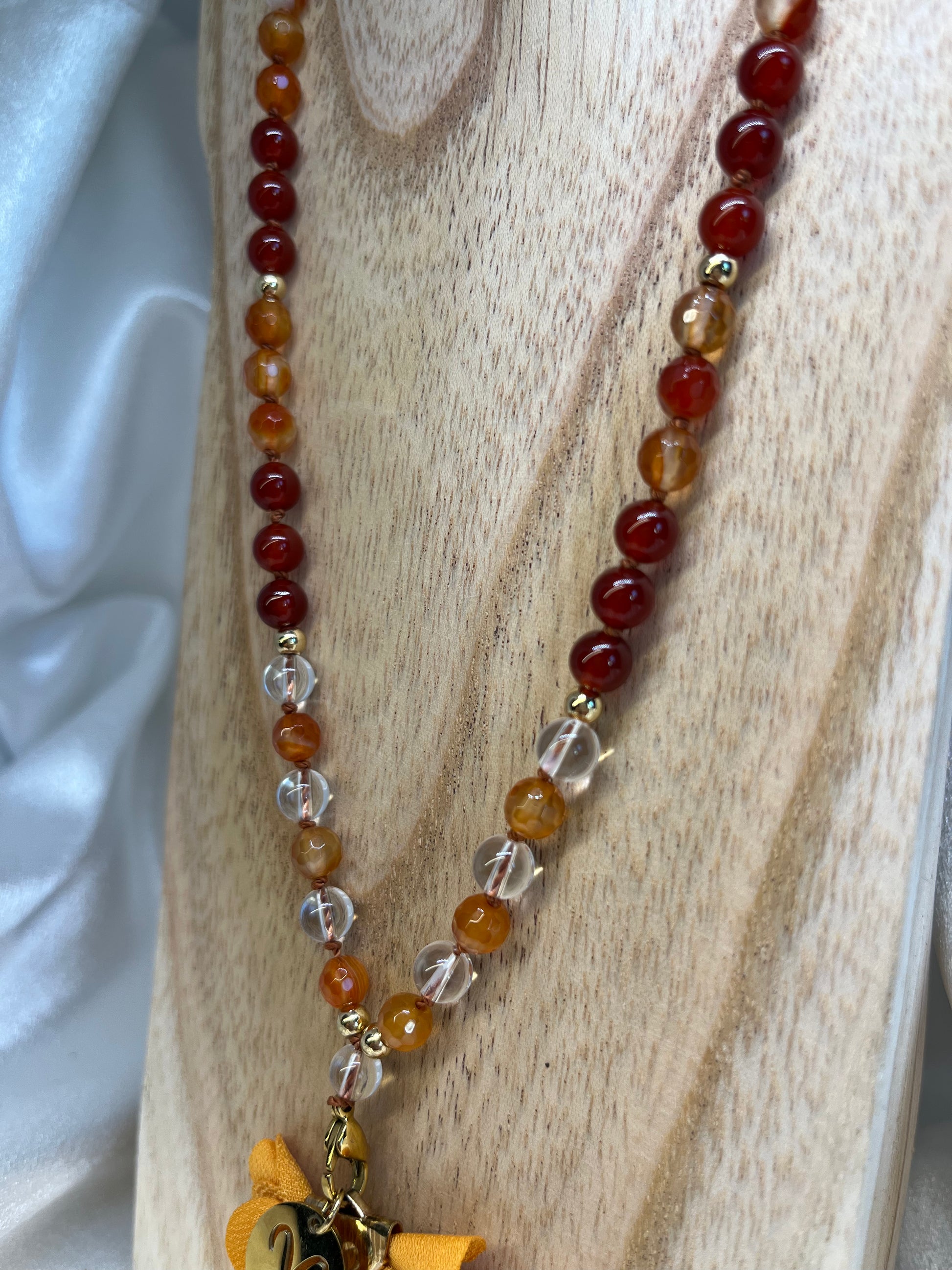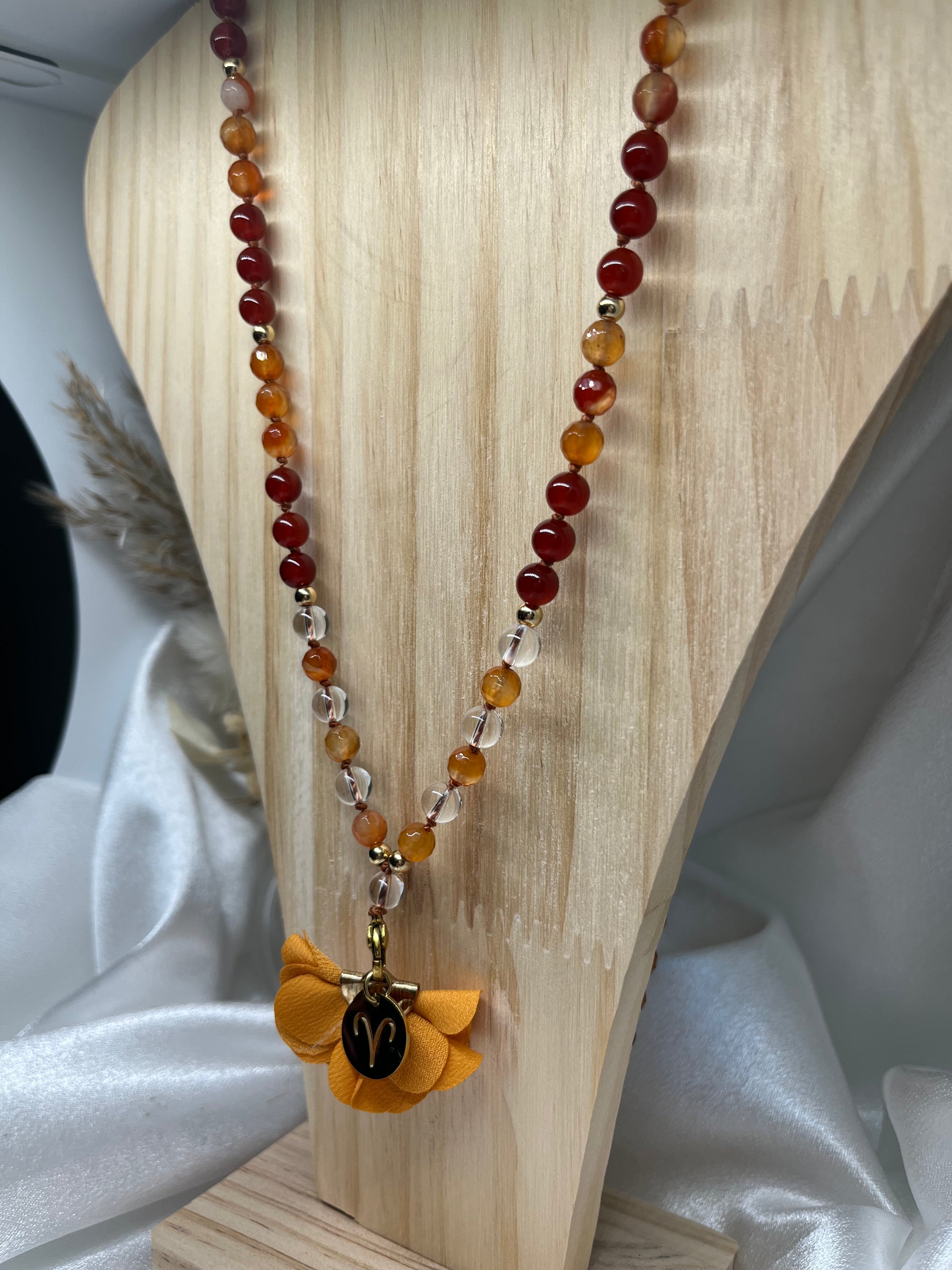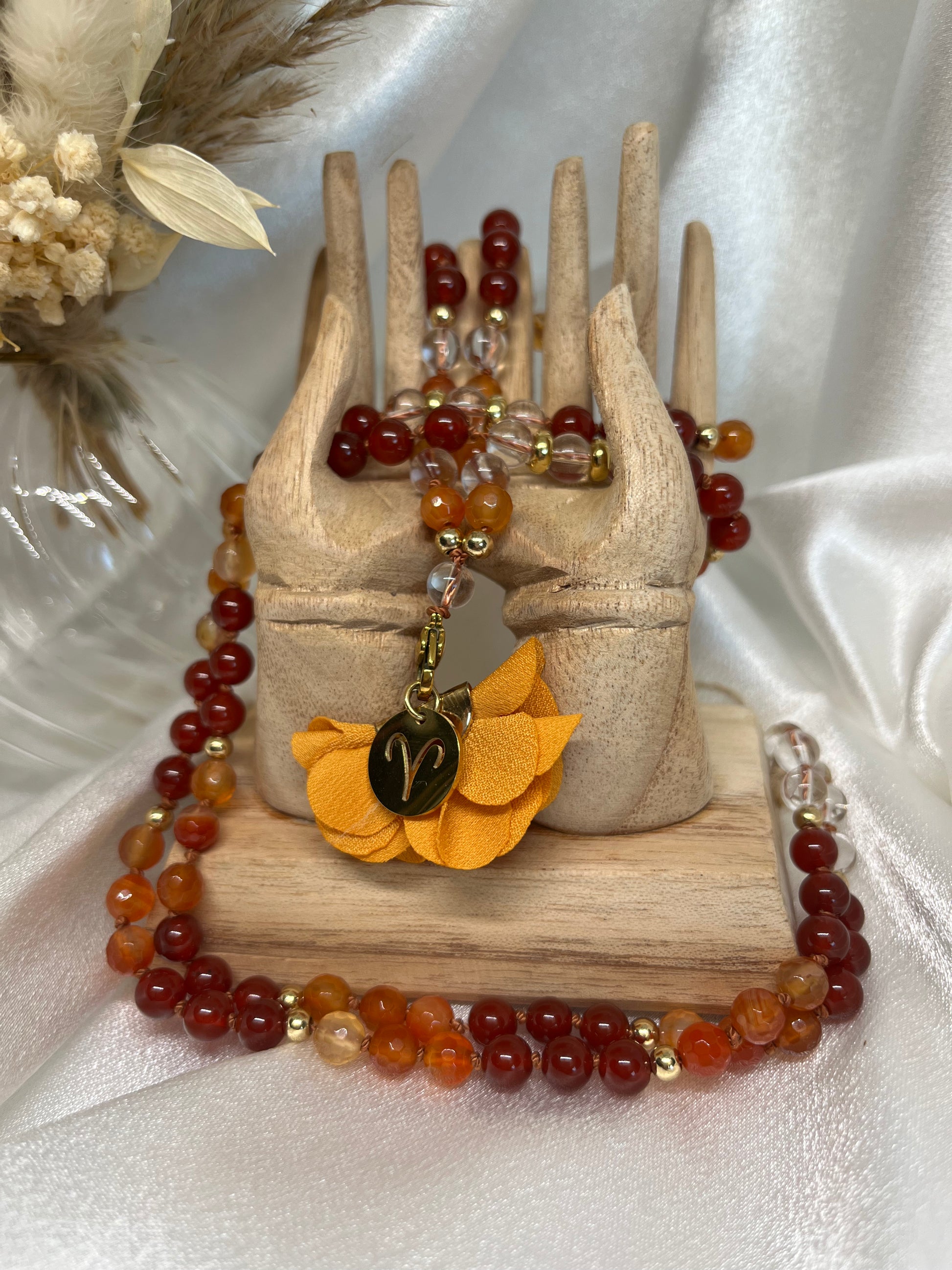 Au centre, un pendentif orange dédié au Bélier 🌞 vient illuminer le mala, renforçant son énergie d’action, de passion et de feu intérieur.