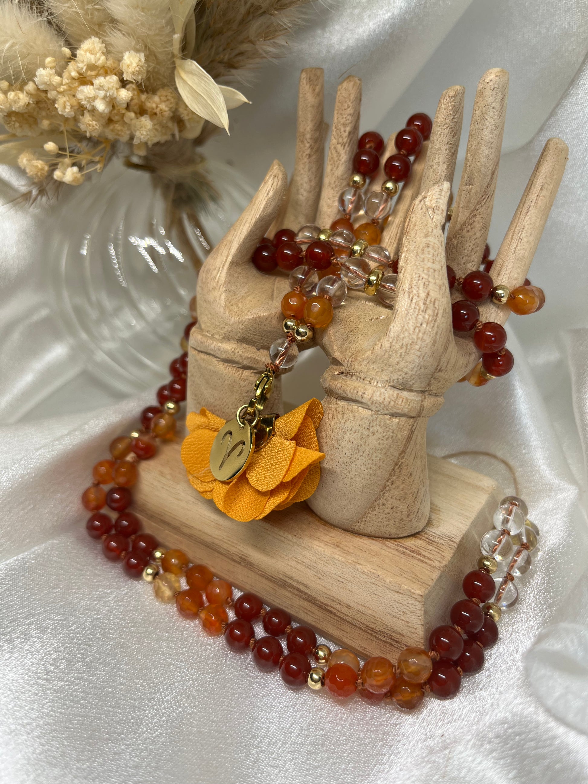 Ce mala vibrant est composé de 108 perles naturelles de 6 mm, unissant l’énergie flamboyante de la Cornaline, la force ancrée de l’Agate Rouge et la clarté lumineuse du Cristal de Roche. Pensé comme un talisman de vitalité et de confiance, il est particulièrement en résonance avec l’énergie du signe du Bélier ♈.