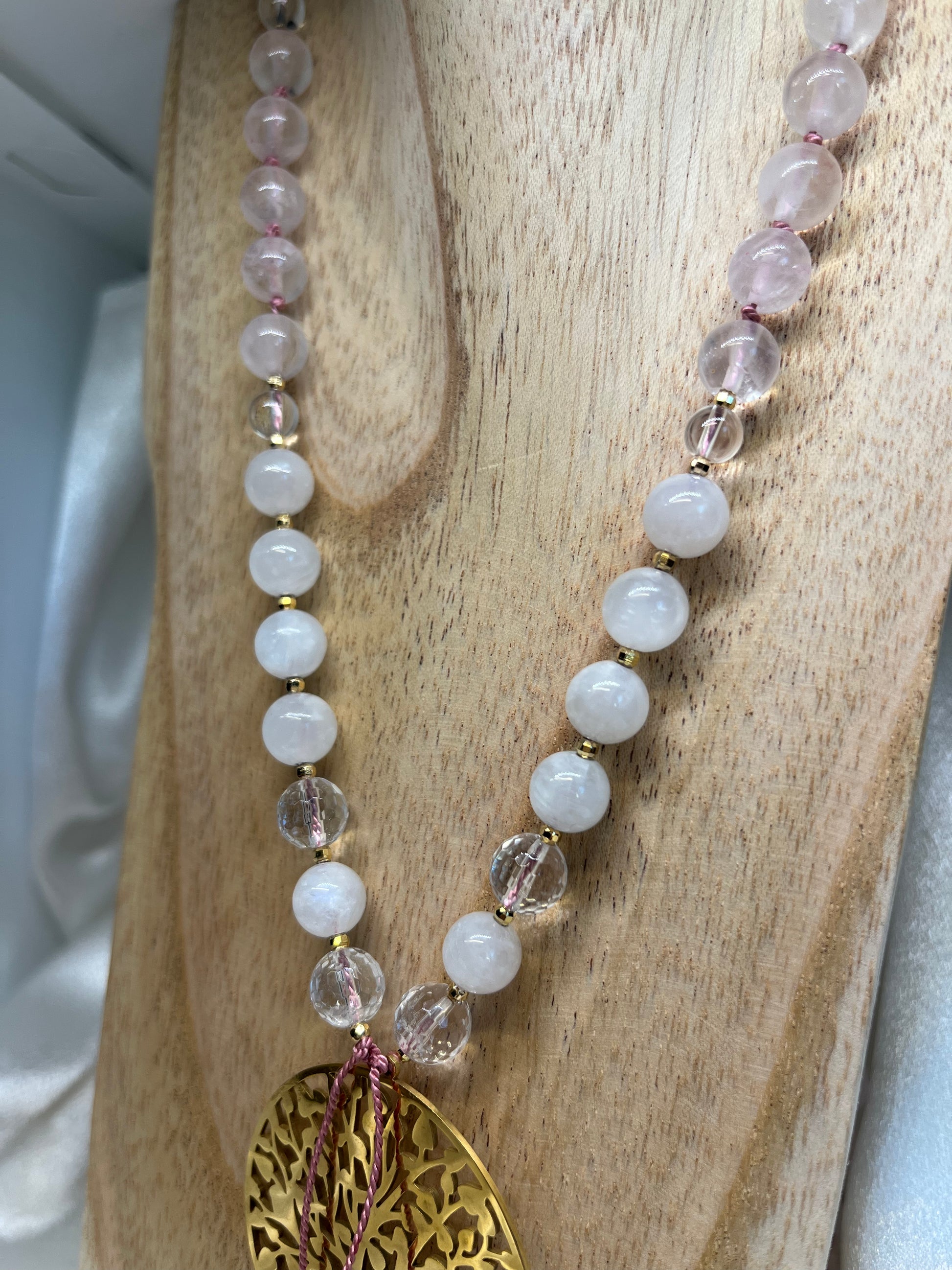 Ce mala délicat et lumineux est composé de 108 perles naturelles de 8 mm, réunissant la douceur infinie du Quartz Rose, la sagesse intuitive de la Pierre de Lune et la clarté du Cristal de Roche. Une combinaison subtile et harmonieuse, pensée comme un véritable talisman du cœur et de l’âme.