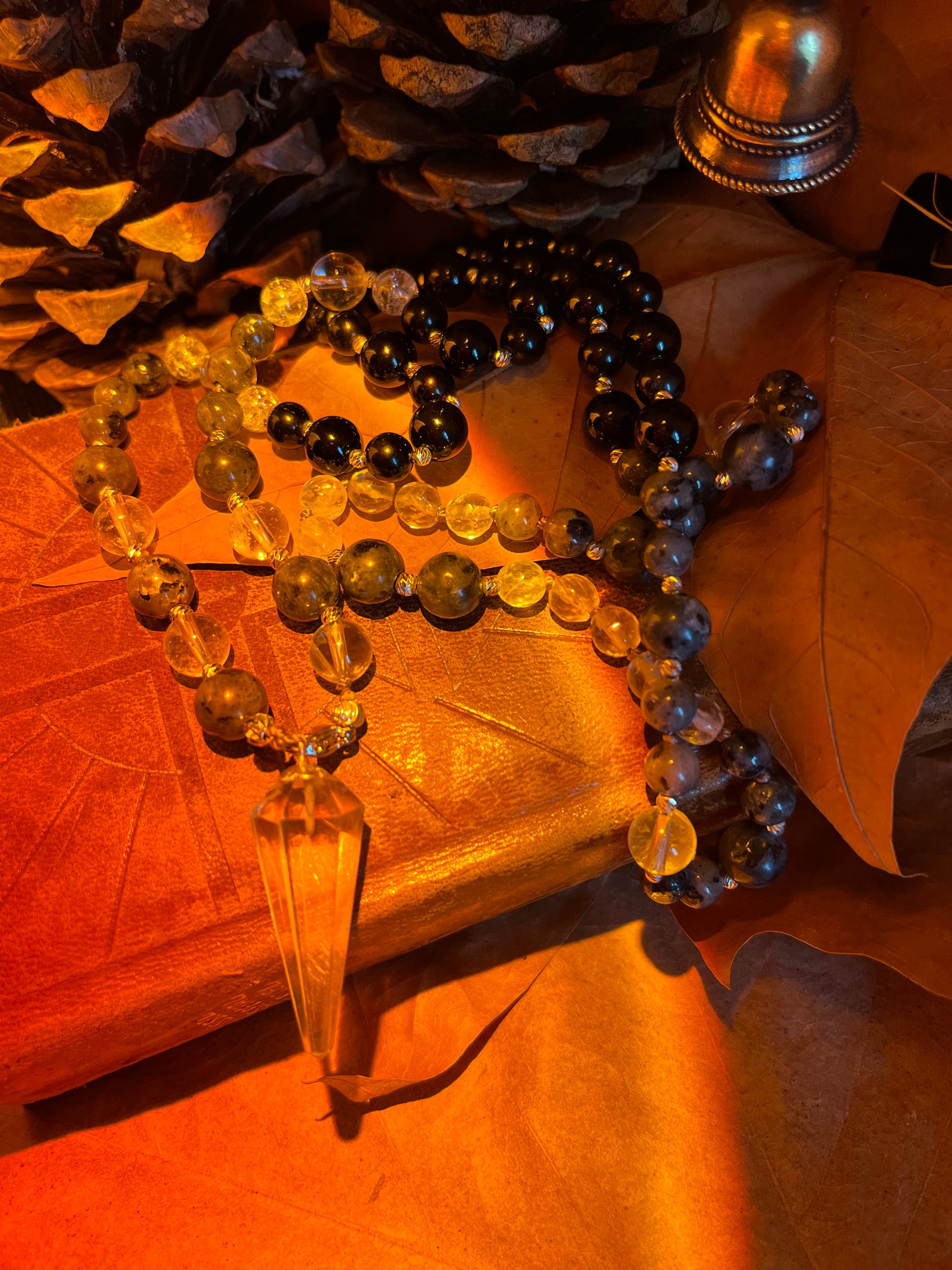 Mala pendule “Voile d’Ombre” – Obsidienne noire, labradorite, cristal de roche – Bijou spirituel – Rituel Samhain – Lithothérapie – Samhain