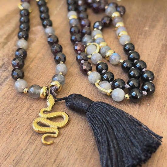 Ce mala intense et raffiné est composé de 108 perles naturelles de 6 mm, réunissant la puissance du Grenat, la protection de la Labradorite et la force purificatrice de la Tourmaline Noire. Une combinaison énergétique forte, pensée comme un talisman de transformation et de protection.