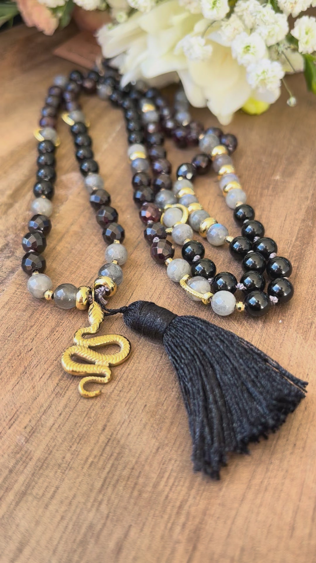 Le mala est magnifié par des apprêts dorés élégants, un pompon noir symbole d’ancrage et de mystère, et un pendentif serpent doré. Symbole ancien de transformation, de renaissance et de puissance vitale, le serpent incarne la régénération et la sagesse profonde.