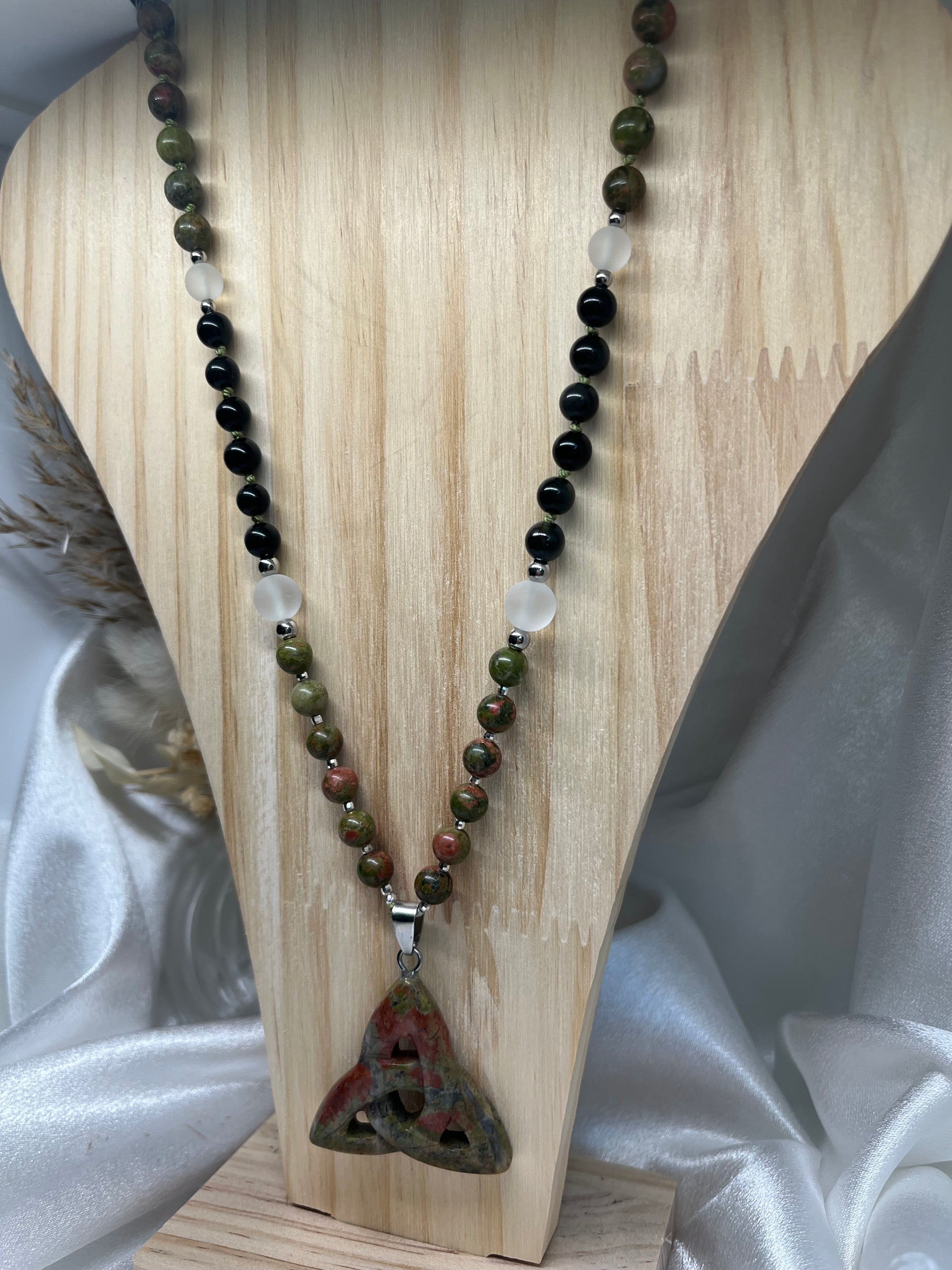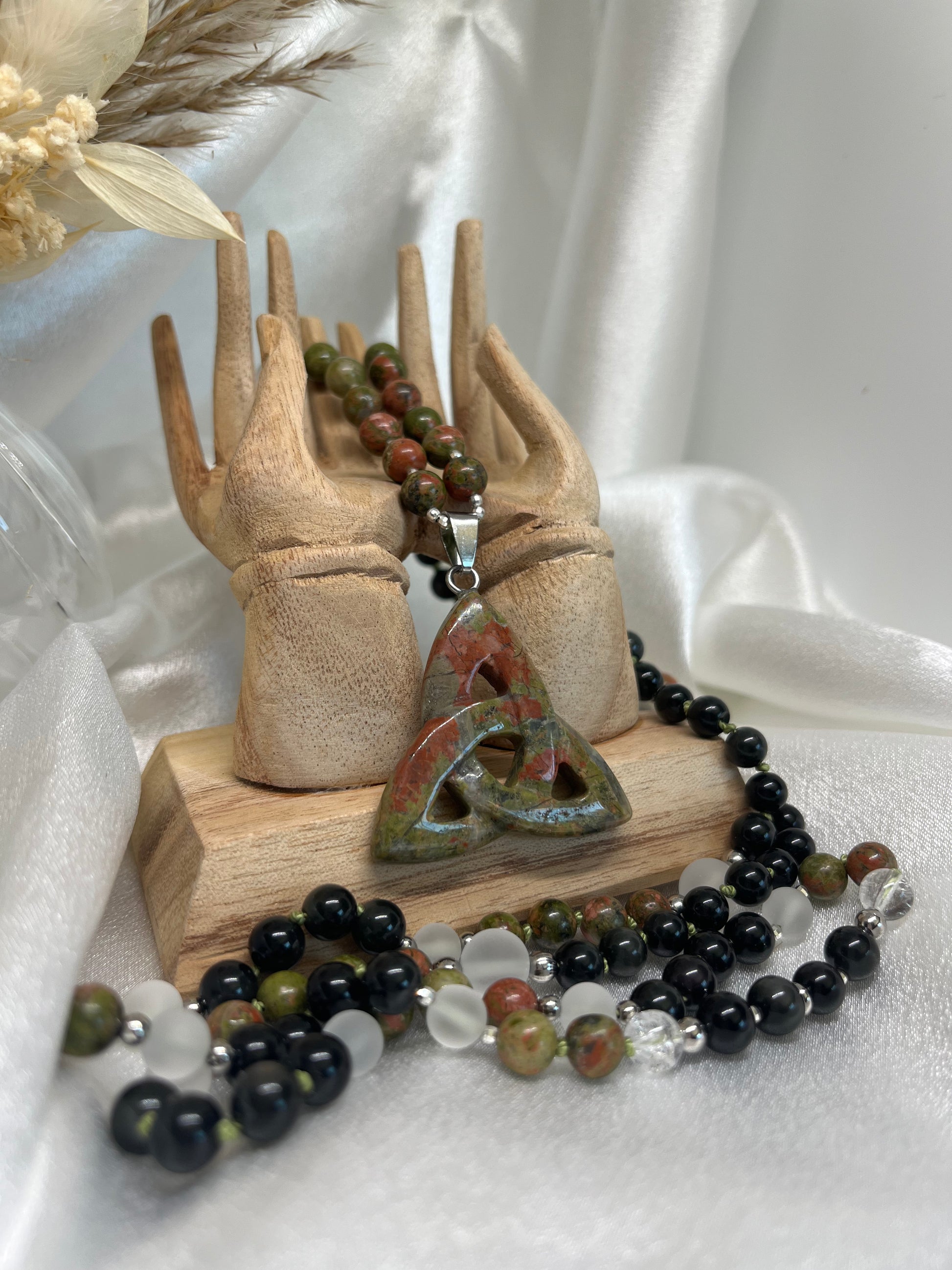 Ce mala unit la douceur de l’Unakite, la puissance protectrice de la Tourmaline et la lumière pure du Cristal de Roche, en un compagnon sacré pour votre cheminement intérieur.