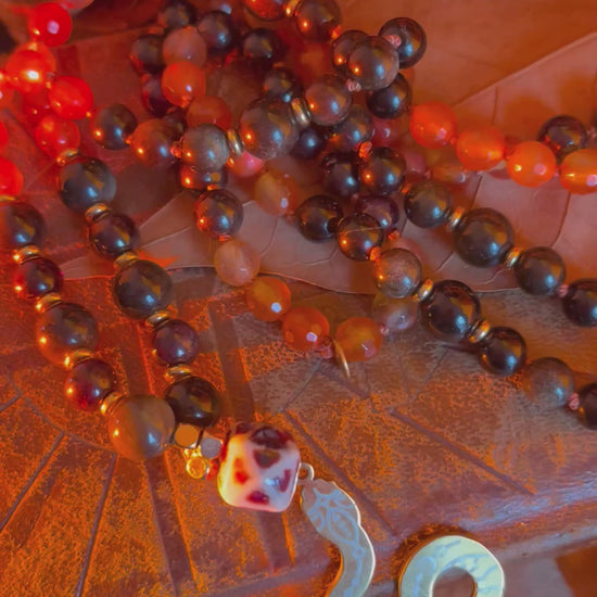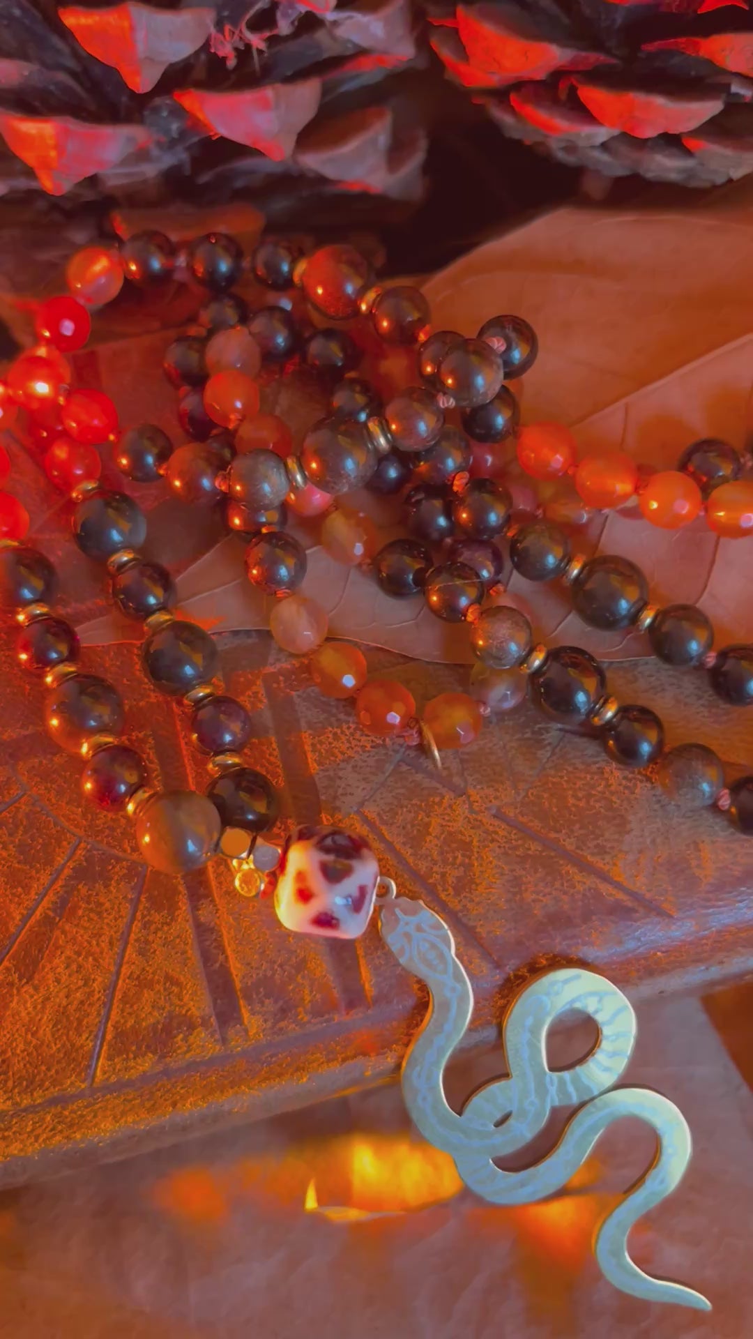 Mala “La Serpiente” – Mala espiritual en cornalina, obsidiana dorada y granate – Talismán de transformación y protección – Litoterapia 108