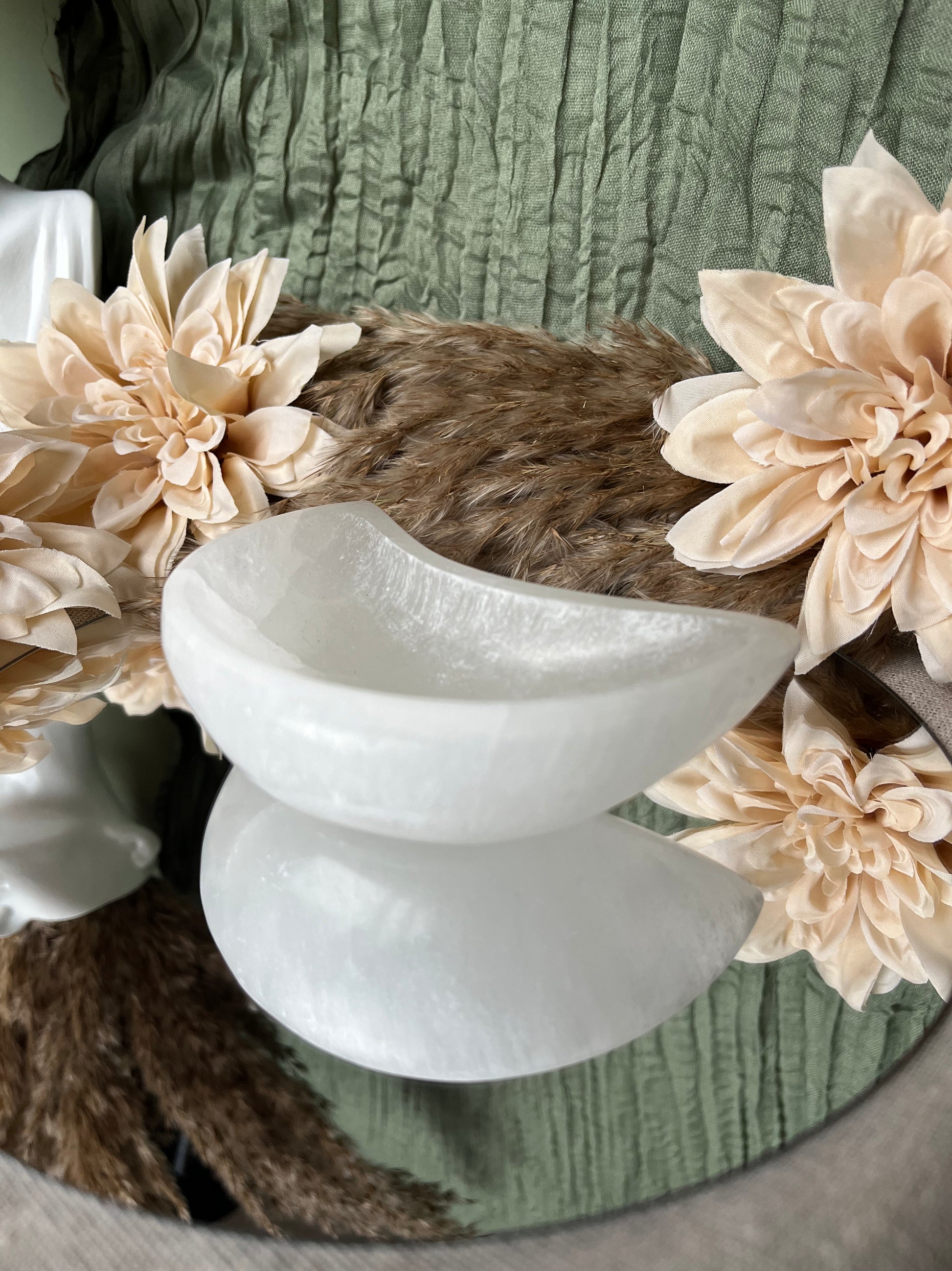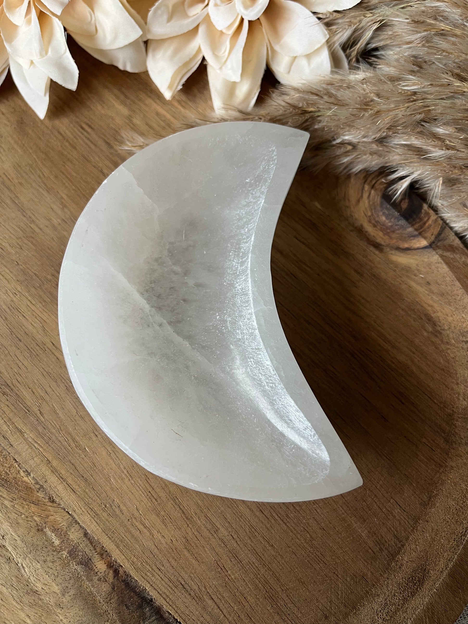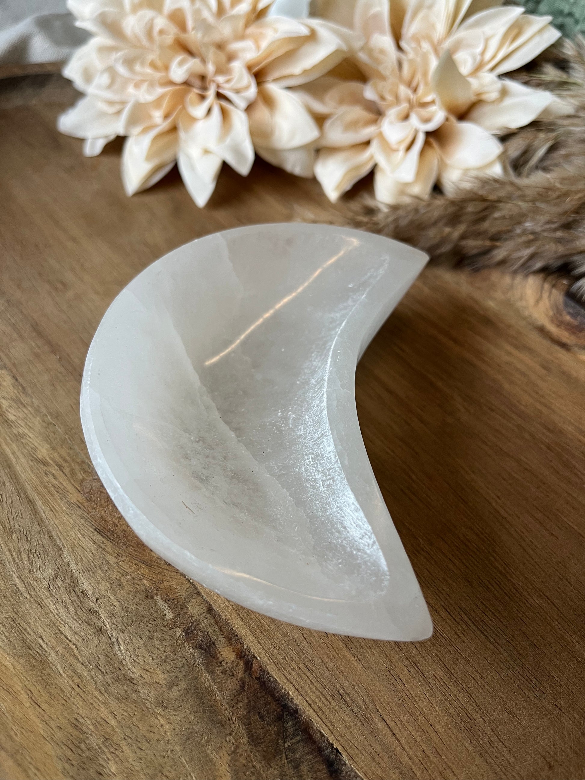 Taillé en forme de lune, ce bol en sélénite est un véritable écrin de lumière. La sélénite - pierre sacrée de clarté et de paix - est reconnue pour sa capacité naturelle à purifier, recharger et harmoniser les minéraux ainsi que les objets énergétiques. Déposé dans ton espace sacré, il devient un point d'ancrage, un lieu où la lumière revient toujours.