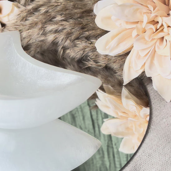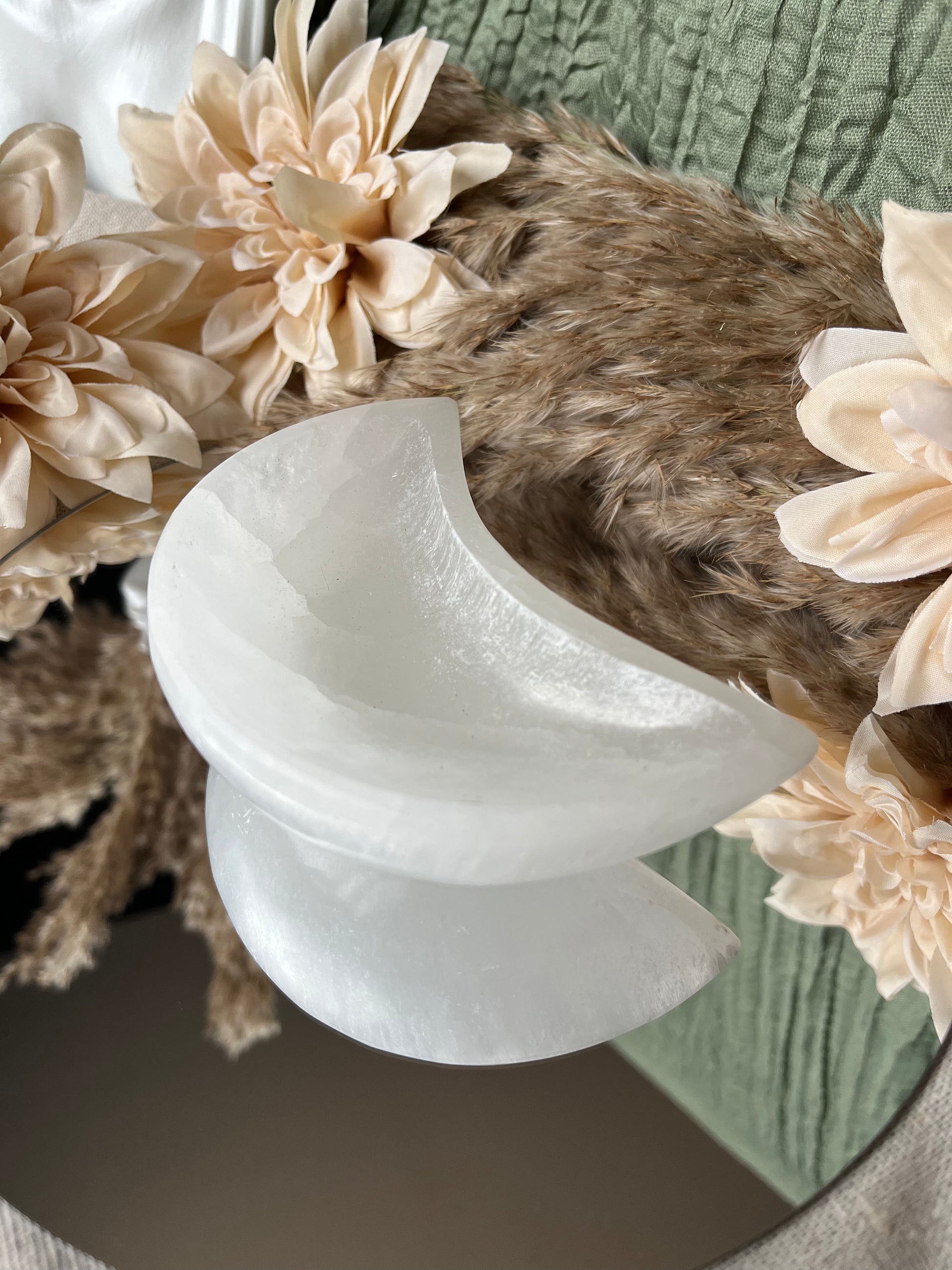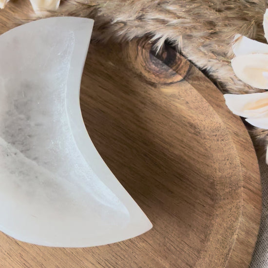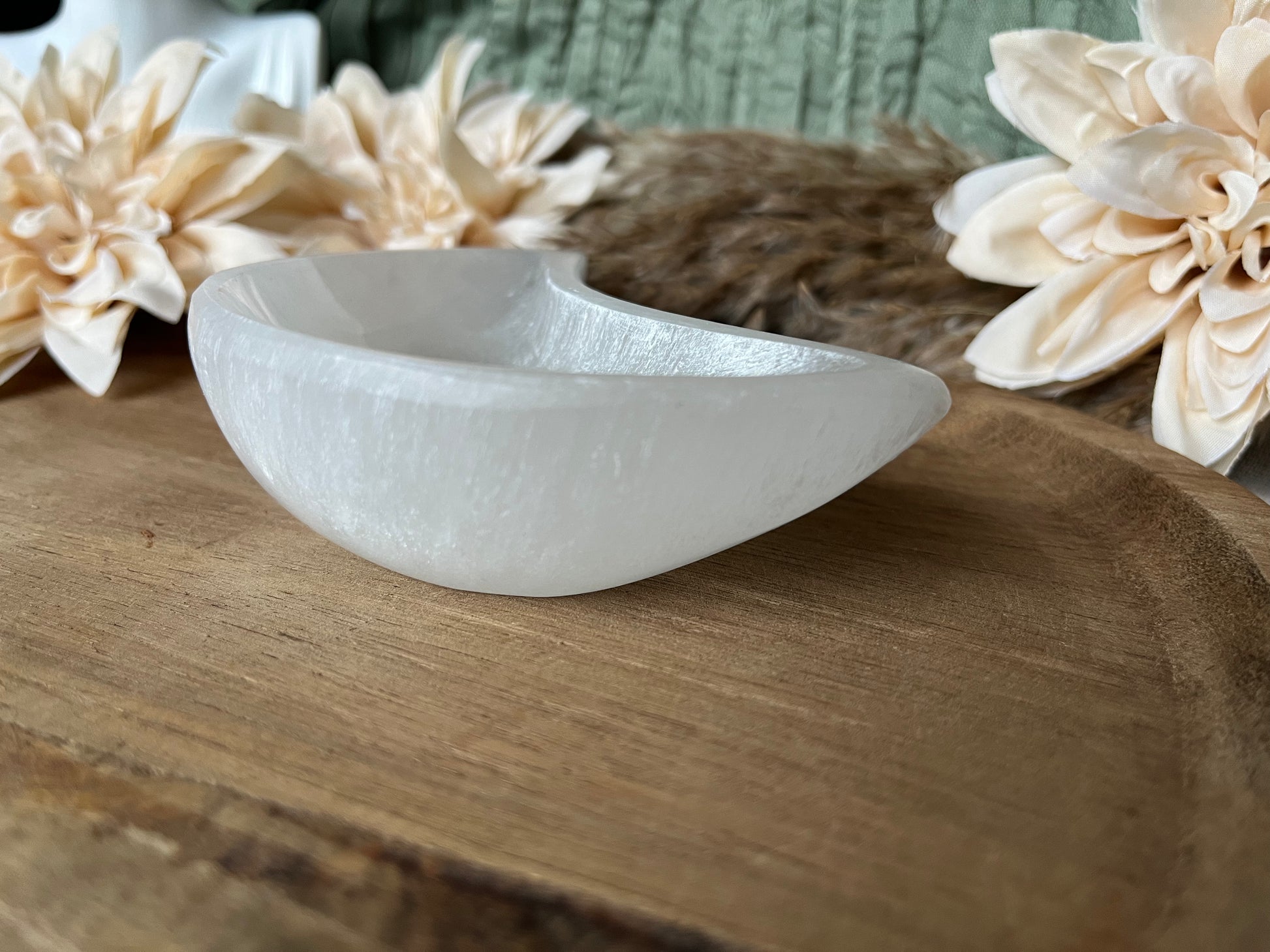 Taillé en forme de lune, ce bol en sélénite est un véritable écrin de lumière. La sélénite - pierre sacrée de clarté et de paix - est reconnue pour sa capacité naturelle à purifier, recharger et harmoniser les minéraux ainsi que les objets énergétiques. Déposé dans ton espace sacré, il devient un point d'ancrage, un lieu où la lumière revient toujours.