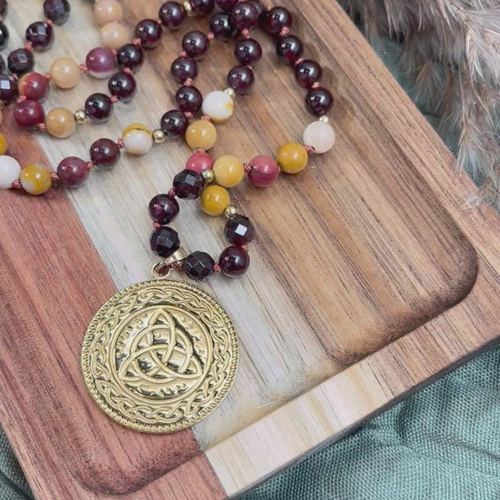 Mala « Feu sacré » - PASSION - FORCE VITALE - ALIGNEMENT - Grenat - Cristal de roche - Mookaite
