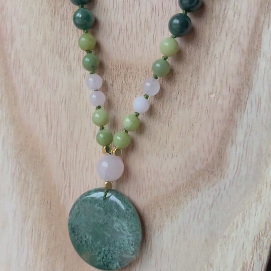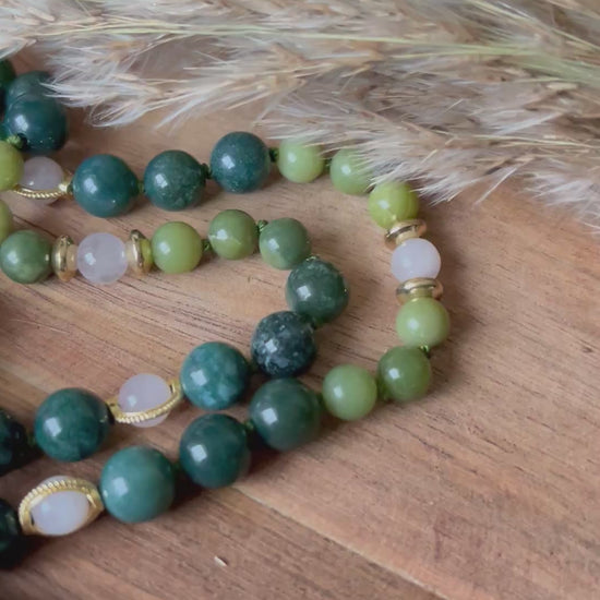 Mala « Voix de la Terre Rose » - ANCRAGE - DOUCEUR - HARMONIE - Jade vert - Agate mousse - Quartz Rose